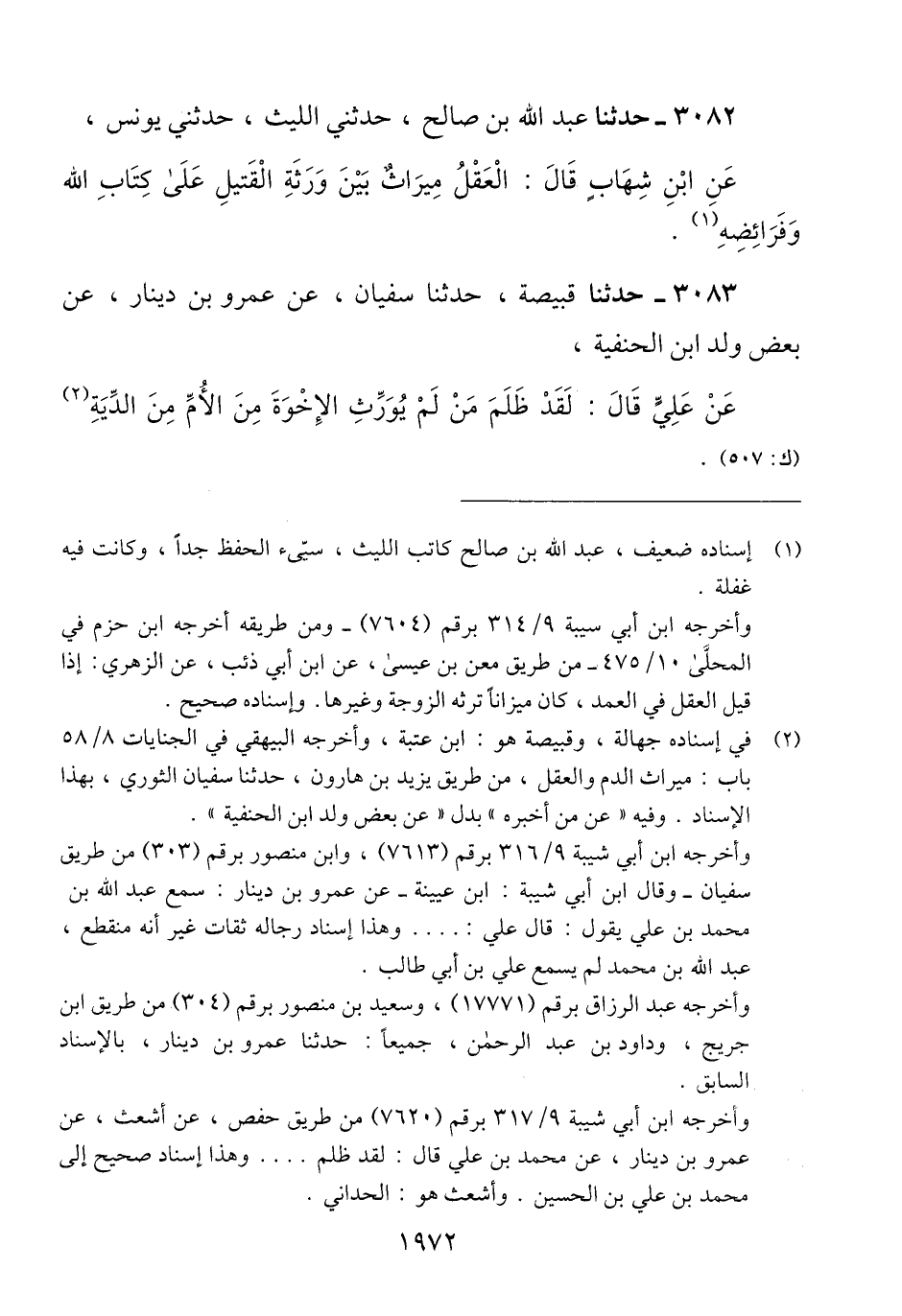 3082 - حَدَّثَنَا عَبْدُ اللَّهِ بْنُ صَالِحٍ، حَدَّثَنِي اللَّيْثُ، حَدَّثَنِي يُونُسُ، عَنْ ابْنِ شِهَابٍ، قَالَ: «§الْعَقْلُ مِيرَاثٌ بَيْنَ وَرَثَةِ الْقَتِيلِ عَلَى كِتَابِ اللَّهِ وَفَرَائِضِهِ» Qإسناده ضعيف عبد الله بن صالح كاتب الليث سيئ الحفظ جدا وكانت فيه غفلة
