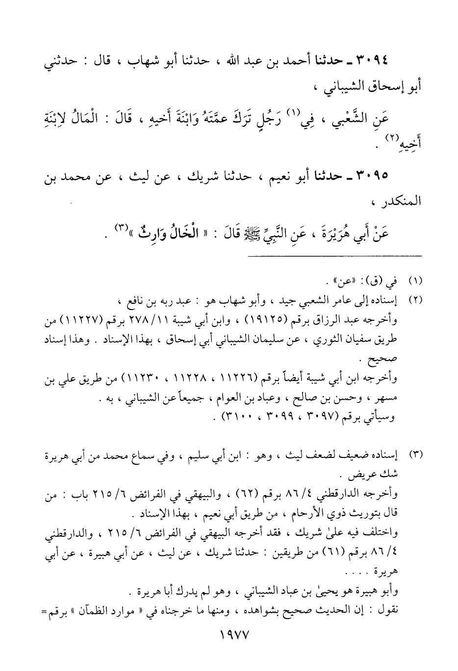 3095 - حَدَّثَنَا أَبُو نُعَيْمٍ، حَدَّثَنَا شَرِيكٌ، عَنْ لَيْثٍ، عَنْ مُحَمَّدِ بْنِ الْمُنْكَدِرِ، عَنْ أَبِي هُرَيْرَةَ، عَنِ النَّبِيِّ صَلَّى اللهُ عَلَيْهِ وَسَلَّمَ قَالَ: «§الْخَالُ وَارِثٌ» Qإسناده ضعيف لضعف ليث