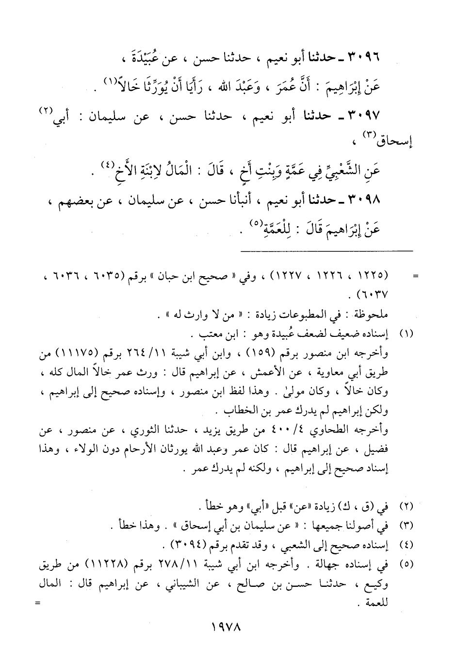 3096 - حَدَّثَنَا أَبُو نُعَيْمٍ، حَدَّثَنَا حَسَنٌ، عَنْ عُبَيْدَةَ، عَنْ إِبْرَاهِيمَ: أن عُمَرَ، وَعَبْدَ اللَّهِ «رَأَيَا §أَنْ يُوَرِّثَا خَالًا» Qإسناده ضعيف لضعف عبيدة وهو: ابن معتب