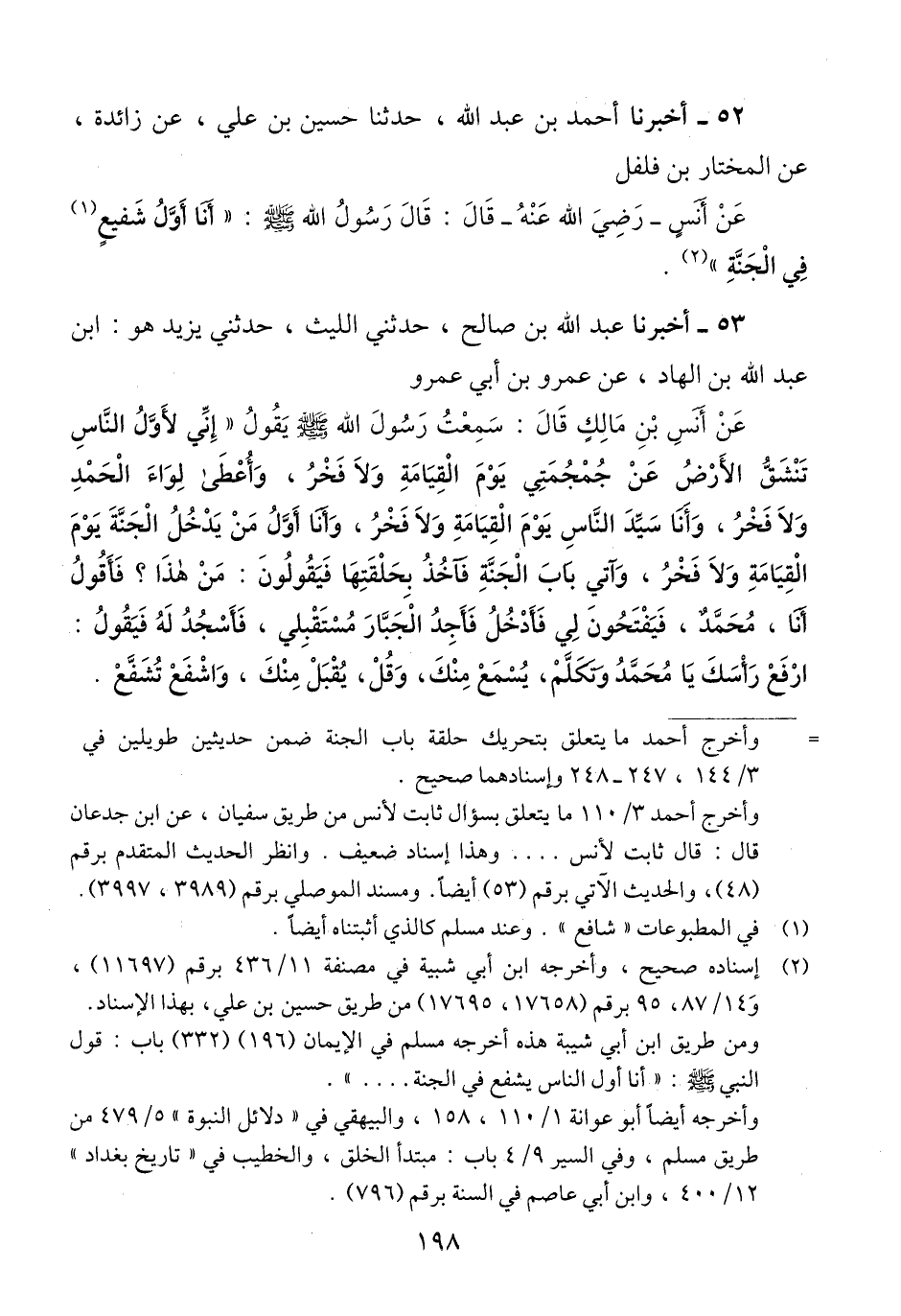 52 - أَخْبَرَنَا أَحْمَدُ بْنُ عَبْدِ اللَّهِ، حَدَّثَنَا حُسَيْنُ بْنُ عَلِيٍّ، عَنْ زَائِدَةَ، عَنِ الْمُخْتَارِ بْنِ فُلْفُلٍ، عَنْ أَنَسٍ رَضِيَ اللَّهُ عَنْهُ، قَالَ: قَالَ رَسُولُ اللَّهِ صَلَّى اللهُ عَلَيْهِ وَسَلَّمَ: «§أَنَا أَوَّلُ شفيعٍ فِي الْجَنَّةِ» Qإسناده صحيح