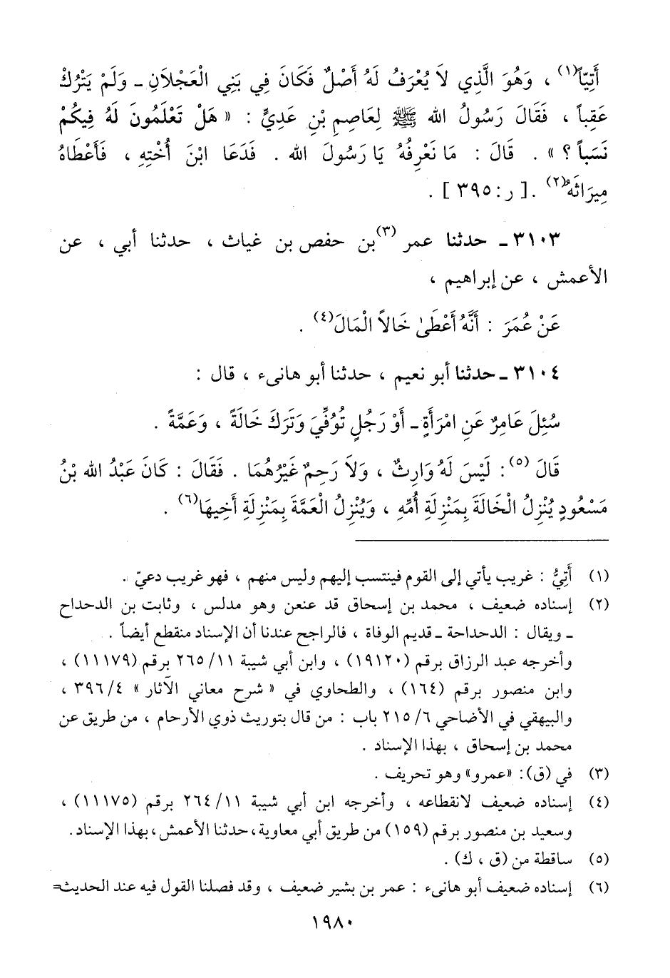 3103 - حَدَّثَنَا عُمَرُ بْنُ حَفْصِ بْنِ غِيَاثٍ، حَدَّثَنَا أَبِي، عَنْ الْأَعْمَشِ، عَنْ إِبْرَاهِيمَ، عَنْ عُمَرَ: «أَنَّهُ §أَعْطَى خَالًا الْمَالَ» Qإسناده ضعيف لانقطاعه