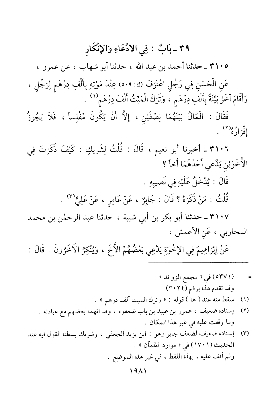3105 - حَدَّثَنَا أَحْمَدُ بْنُ عَبْدِ اللَّهِ، حَدَّثَنَا أَبُو شِهَابٍ، عَنْ عَمْرٍو، عَنْ الْحَسَنِ، فِي رَجُلٍ اعْتَرَفَ عِنْدَ مَوْتِهِ بِأَلْفِ دِرْهَمٍ لِرَجُلٍ، وَأَقَامَ آخَرُ بَيِّنَةً بِأَلْفِ دِرْهَمٍ، وَتَرَكَ الْمَيِّتُ أَلْفَ دِرْهَمٍ، فَقَالَ: «§الْمَالُ بَيْنَهُمَا نِصْفَيْنِ، إِلَّا أَنْ يَكُونَ مُفْلِسًا، فَلَا يَجُوزُ إِقْرَارُهُ» Qإسناده ضعيف عمرو بن عبيد بن باب ضعفوه وقد اتهمه بعضهم مع عبادة