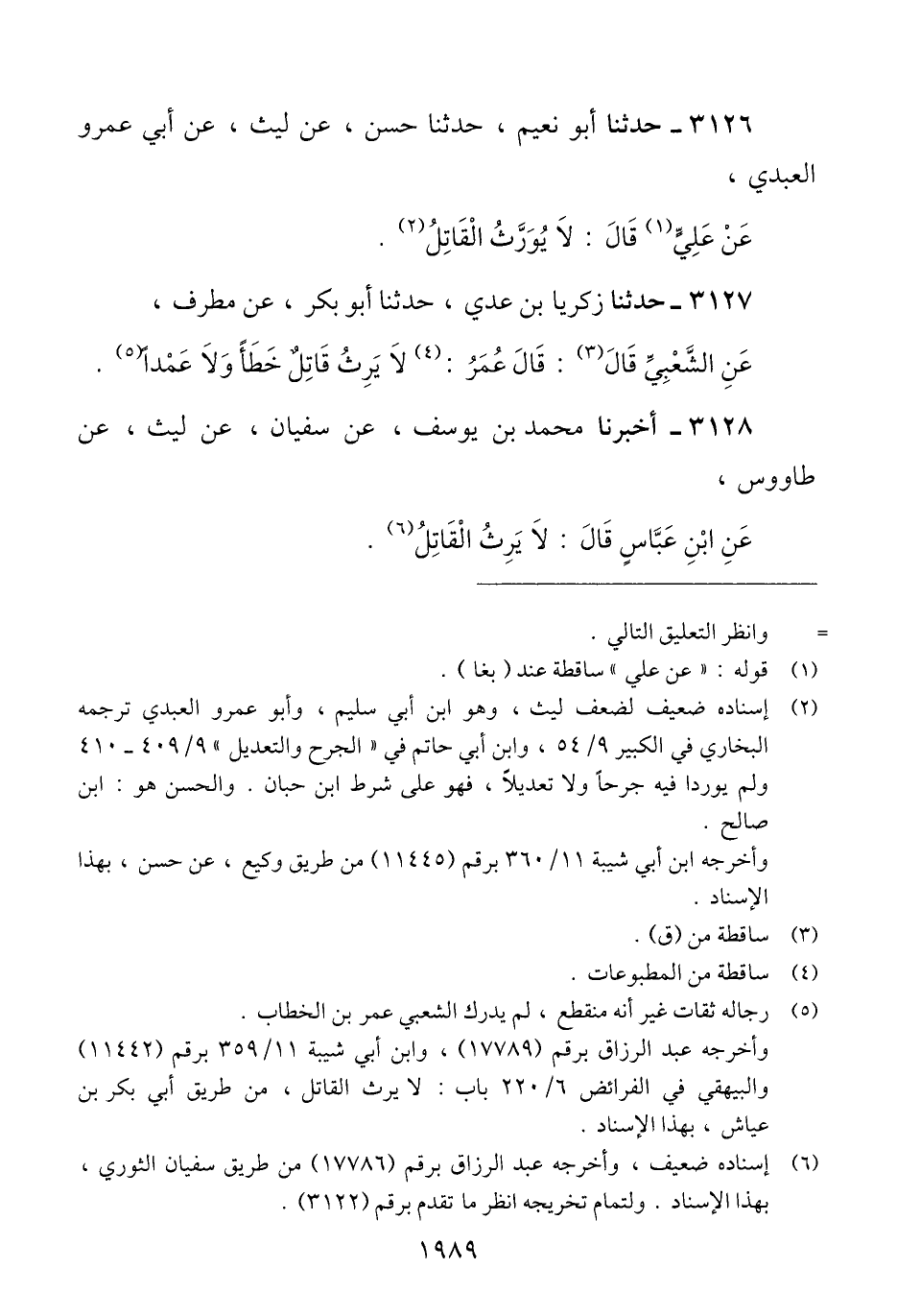 3126 - حَدَّثَنَا أَبُو نُعَيْمٍ، حَدَّثَنَا حَسَنٌ، عَنْ لَيْثٍ، عَنْ أَبِي عَمْرٍو الْعَبْدِيِّ، عَنْ عَلِيٍّ، قَالَ: «§لَا يُوَرَّثُ الْقَاتِلُ» Qإسناده ضعيف لضعف ليث وهو ابن أبي سليم