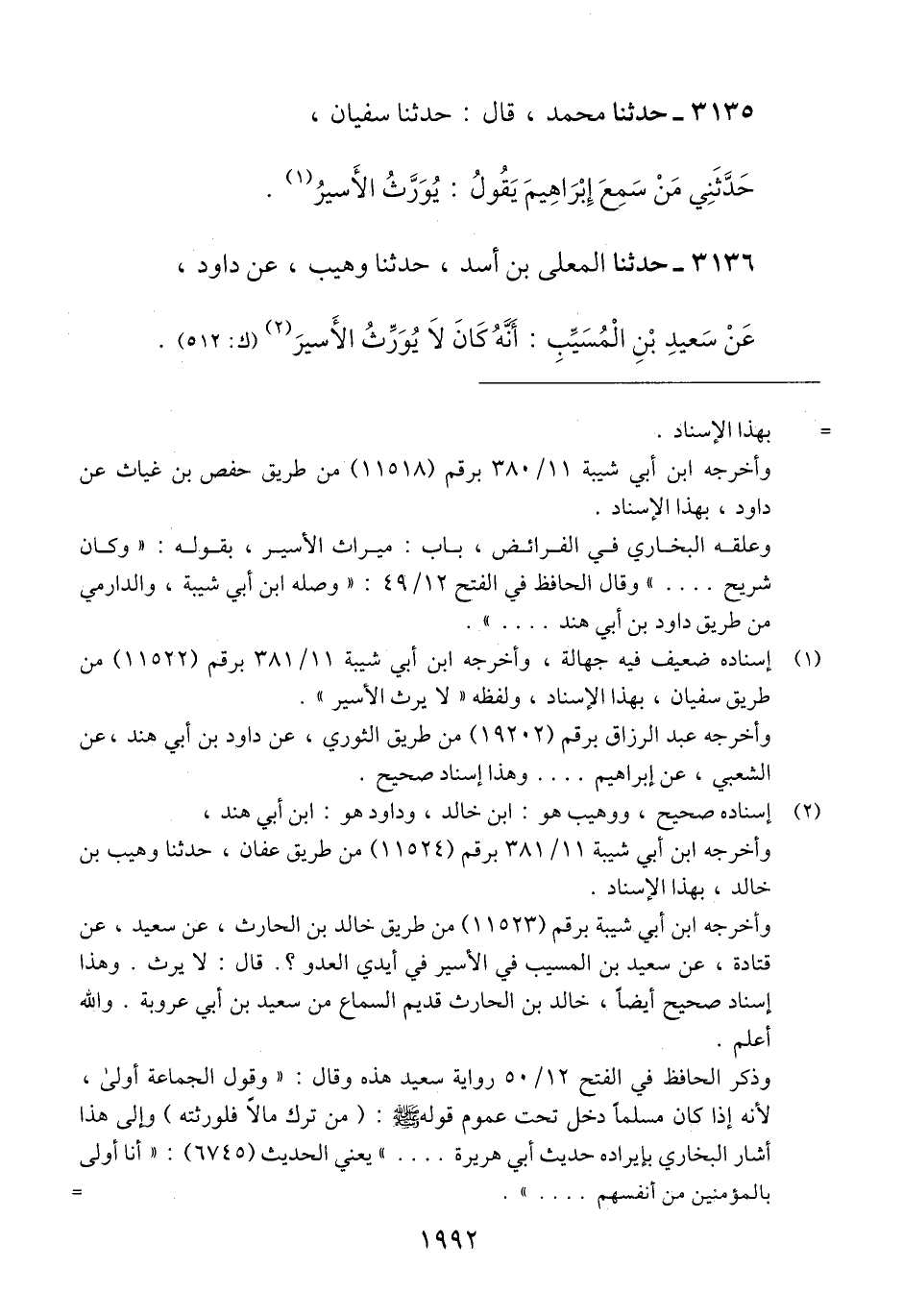 3136 - حَدَّثَنَا الْمُعَلَّى بْنُ أَسَدٍ، حَدَّثَنَا وُهَيْبٌ، عَنْ دَاوُدَ، عَنْ سَعِيدِ بْنِ الْمُسَيِّبِ: «أَنَّهُ كَانَ §لَا يُوَرِّثُ الْأَسِيرَ» Qإسناده صحيح