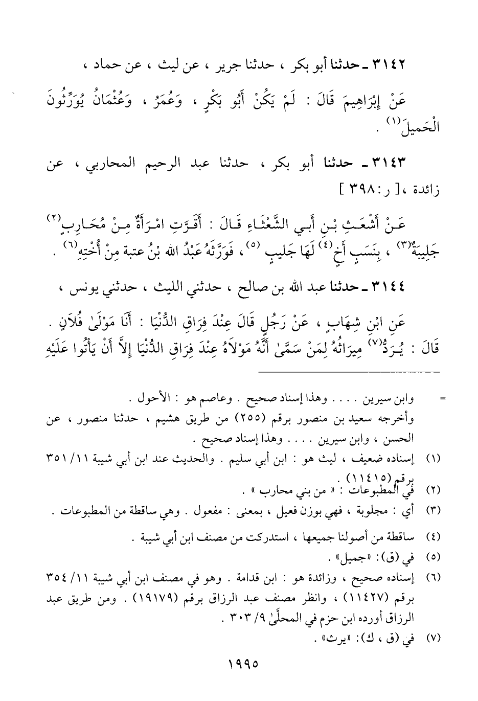 3143 - حَدَّثَنَا أَبُو بَكْرٍ، حَدَّثَنَا عَبْدُ الرَّحِيمِ الْمُحَارِبِيُّ، عَنْ زَائِدَةَ، عَنْ أَشْعَثَ بْنِ أَبِي الشَّعْثَاءِ، قَالَ: «§أَقَرَّتْ امْرَأَةٌ مِنْ مُحَارِبٍ جَلِيبَةٌ، بِنَسَبٍ أَخٍ لَهَا جَلِيبٍ، فَوَرَّثَهُ عَبْدُ اللَّهِ بْنُ عُتْبَةَ، مِنْ أُخْتِهِ» Qإسناده صحيح
