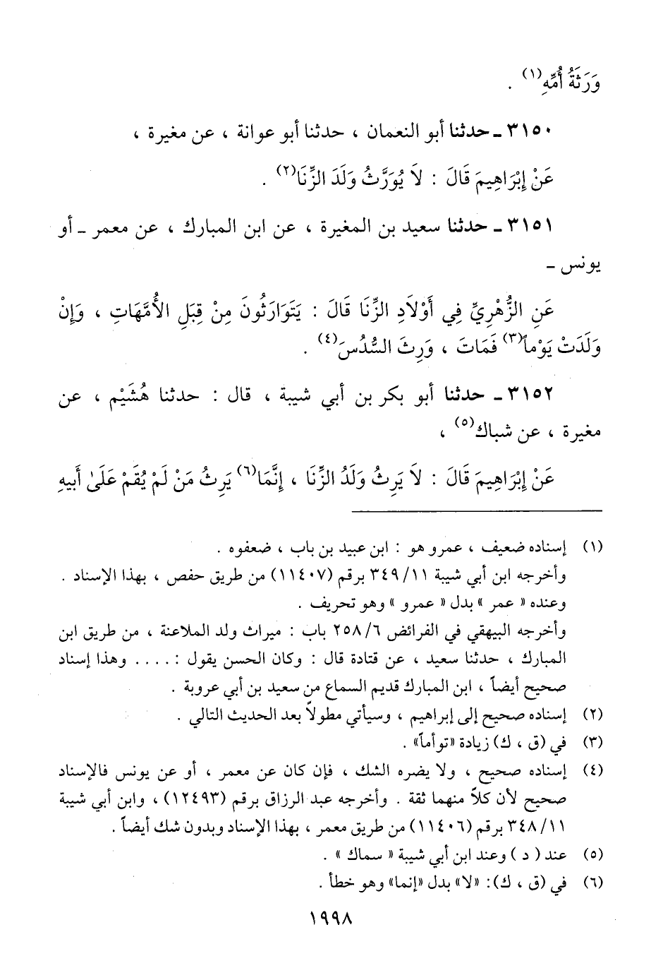 3150 - حَدَّثَنَا أَبُو النُّعْمَانِ، حَدَّثَنَا أَبُو عَوَانَةَ، عَنْ مُغِيرَةَ، عَنْ إِبْرَاهِيمَ، قَالَ: «§لَا يُوَرَّثُ وَلَدُ الزِّنَا» Qإسناده صحيح إلى إبراهيم