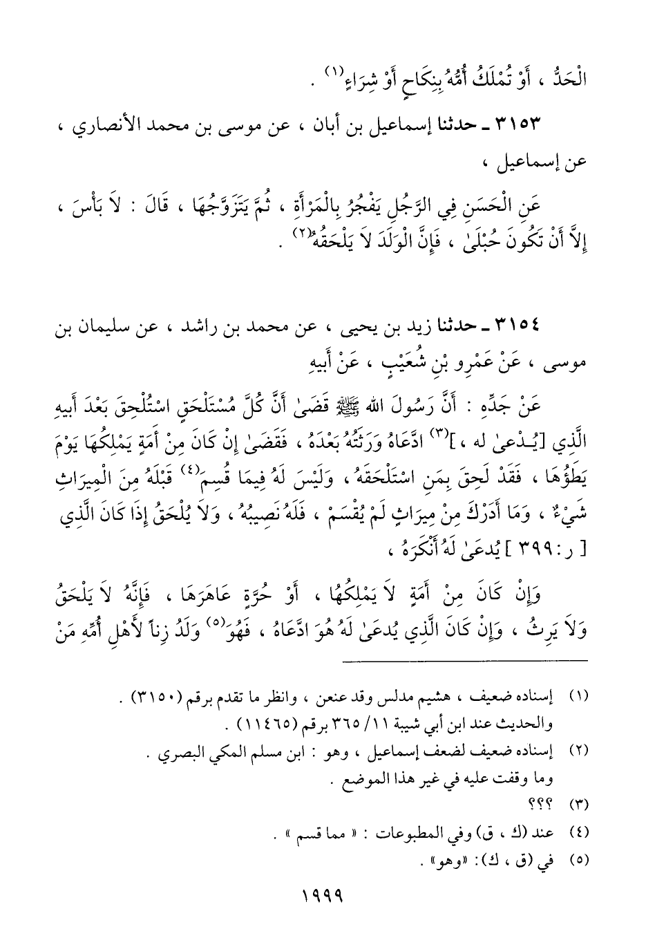 3154 - حَدَّثَنَا زَيْدُ بْنُ يَحْيَى، عَنْ مُحَمَّدِ بْنِ رَاشِدٍ، عَنْ سُلَيْمَانَ بْنِ مُوسَى، عَنْ عَمْرِو بْنِ شُعَيْبٍ، عَنْ أَبِيهِ، عَنْ جَدِّهِ، أن رَسُولَ اللَّهِ صَلَّى اللهُ عَلَيْهِ وَسَلَّمَ «قَضَى أَنَّ §كُلِّ مُسْتَلْحَقٍ اسْتُلْحِقَ بَعْدَ أَبِيهِ الَّذِي يُدْعَى لَهُ ادَّعَاهُ وَرَثَتُهُ بَعْدَهُ، فَقَضَى إِنْ كَانَ مِنْ أَمَةٍ يَمْلِكُهَا يَوْمَ يَطَؤُهَا، فَقَدْ لَحِقَ بِمَنِ اسْتَلْحَقَهُ، وَلَيْسَ لَهُ فيمَّا قُسِمَ قَبْلَهُ مِنَ الْمِيرَاثِ شَيْءٌ، وَمَا أَدْرَكَ مِنْ مِيرَاثٍ لَمْ يُقْسَمْ، فَلَهُ نَصِيبُهُ، وَلَا يَلْحَقُ إِذَا كَانَ الَّذِي يُدْعَى لَهُ أَنْكَرَهُ، وَإِنْ كَانَ مِنْ أَمَةٍ لَا يَمْلِكُهَا، أَوْ حُرَّةٍ عَاهَرَهَا، فَإِنَّهُ لَا يَلْحَقُ وَلَا يَرِثُ، وَإِنْ كَانَ الَّذِي يُدْعَى لَهُ هُوَ ادَّعَاهُ، فهُوَ وَلَدُ زِنَا لِأَهْلِ أُمِّهِ مَنْ -[2000]- كَانُوا حُرَّةً، أَوْ أَمَةً» Qإسناده حسن