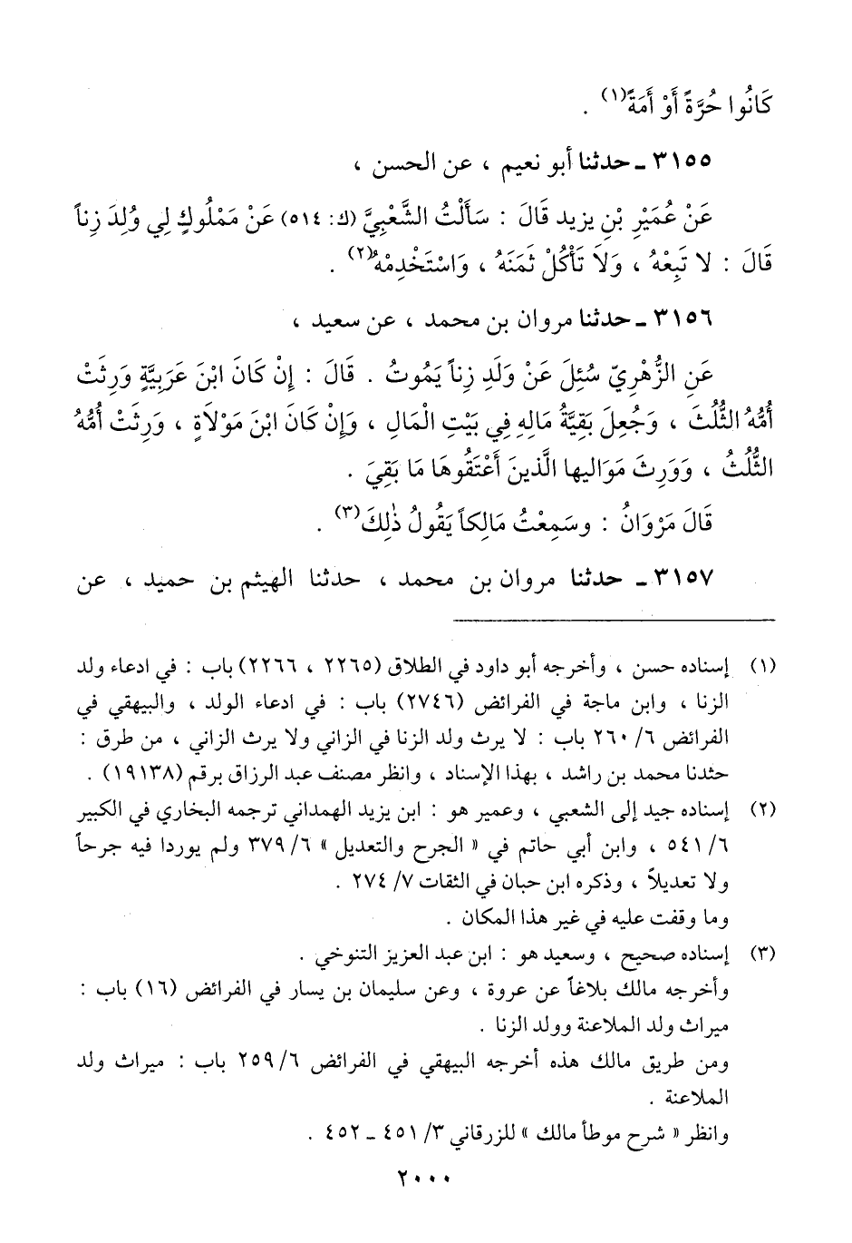 3156 - حَدَّثَنَا مَرْوَانُ بْنُ مُحَمَّدٍ، عَنْ سَعِيدٍ، عَنْ الزُّهْرِيِّ، §سُئِلَ عَنْ وَلَدِ زِنَا يَمُوتُ، قَالَ: «إِنْ كَانَ ابْنَ عَرَبِيَّةٍ وَرِثَتْ أُمُّهُ الثُّلُثَ، وَجُعِلَ بَقِيَّةُ مَالِهِ فِي بَيْتِ الْمَالِ، وَإِنْ كَانَ ابْنَ مَوْلَاةٍ، وَرِثَتْ أُمُّهُ الثُّلُثَ، وَوَرِثَ مَوَالِيهَا الَّذِينَ أَعْتَقُوهَا مَا بَقِيَ» قَالَ مَرْوَانُ: وَسَمِعْتُ مَالِكًا «يَقُولُ ذَلِكَ» Qإسناده صحيح