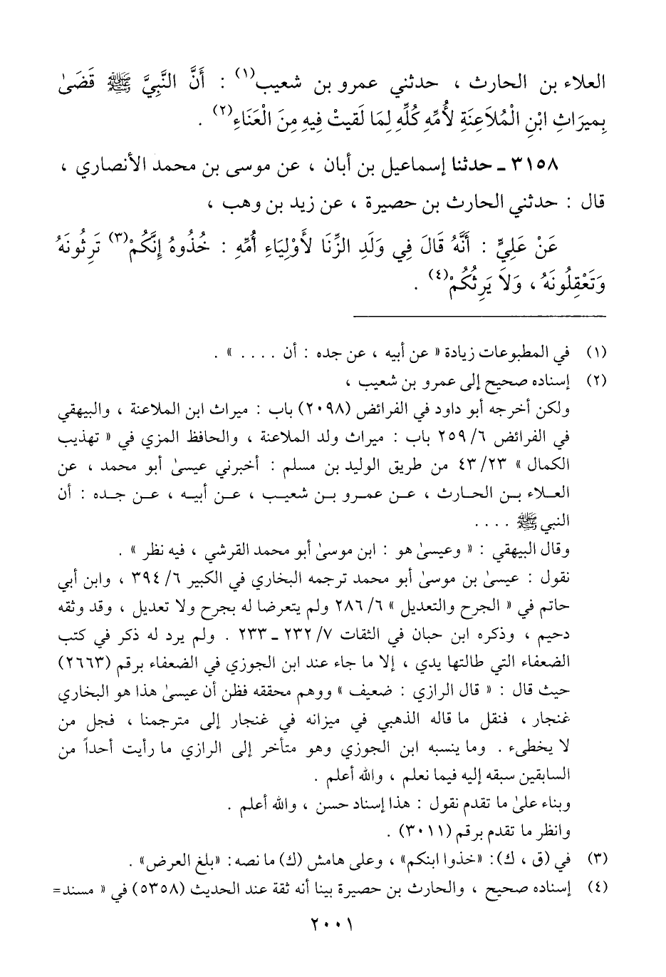3158 - حَدَّثَنَا إِسْمَاعِيلُ بْنُ أَبَانَ، عَنْ مُوسَى بْنِ مُحَمَّدٍ الْأَنْصَارِيِّ، قَالَ: حَدَّثَنِي الْحَارِثُ بْنُ حَصِيرَةَ، عَنْ زَيْدِ بْنِ وَهْبٍ، عَنْ عَلِيٍّ، أَنَّهُ قَالَ فِي وَلَدِ الزِّنَا لِأَوْلِيَاءِ أُمِّهِ: «§خُذُوهُ إْنَكُمْ تَرِثُونَهُ، وَتَعْقِلُونَهُ، وَلَا يَرِثُكُمْ» Qإسناده صحيح