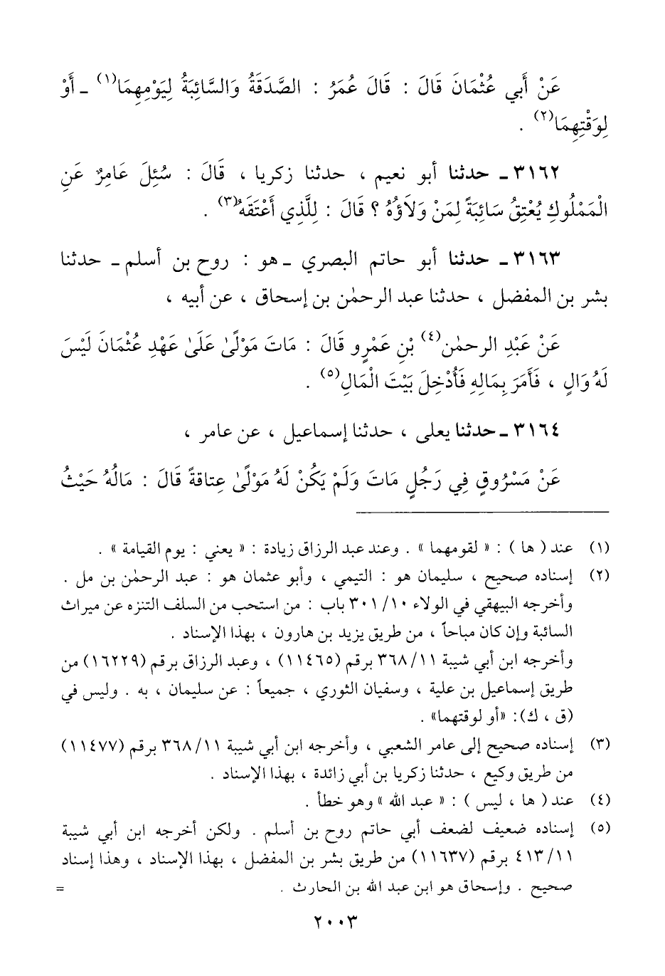 3163 - حَدَّثَنَا أَبُو حَاتِمٍ الْبَصْرِيُّ هُوَ رَوْحُ بْنُ أَسْلَمَ، حَدَّثَنَا بِشْرُ بْنُ الْمُفَضَّلِ، حَدَّثَنَا عَبْدُ الرَّحْمَنِ بْنُ إِسْحَاقَ، عَنْ أَبِيهِ، عَنْ عَبْدِ الرَّحْمَنِ بْنِ عَمْرٍو، قَالَ: «مَاتَ مَوْلًى عَلَى عَهْدِ عُثْمَانَ، َلَيْسَ لَهُ وَالٍ، §فَأَمَرَ بِمَالِهِ فَأُدْخِلَ بَيْتَ الْمَالِ» Qإسناده ضعيف أبي حاتم روح بن أسلم