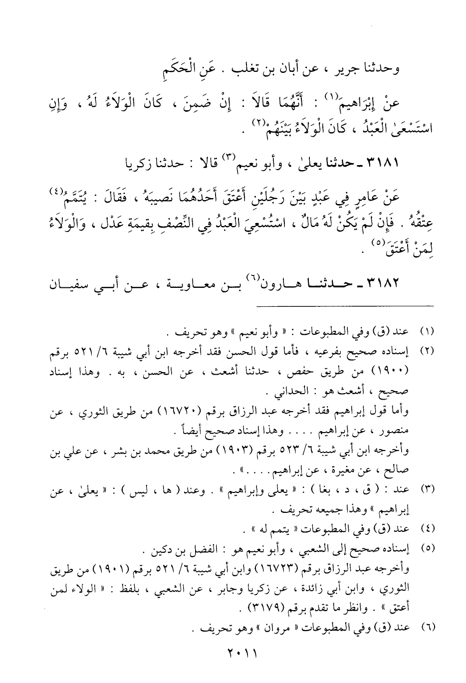 3181 - حَدَّثَنَا يَعْلَى، وَأَبُو نُعَيْمٍ، قَالَا: حَدَّثَنَا زَكَرِيَّا، عَنْ عَامِرٍ، فِي §عَبْدٍ بَيْنَ رَجُلَيْنِ أَعْتَقَ أَحَدُهُمَا نَصِيبَهُ، فَقَالَ: «يُتَمَّمُ عِتْقُهُ. فَإِنْ لَمْ يَكُنْ لَهُ مَالٌ، اسْتُسْعِيَ الْعَبْدُ فِي النِّصْفِ بِقِيمَةِ عَدْلٍ، وَالْوَلَاءُ لِمَنْ أَعْتَقَ» Qإسناده صحيح إلى الشعبي