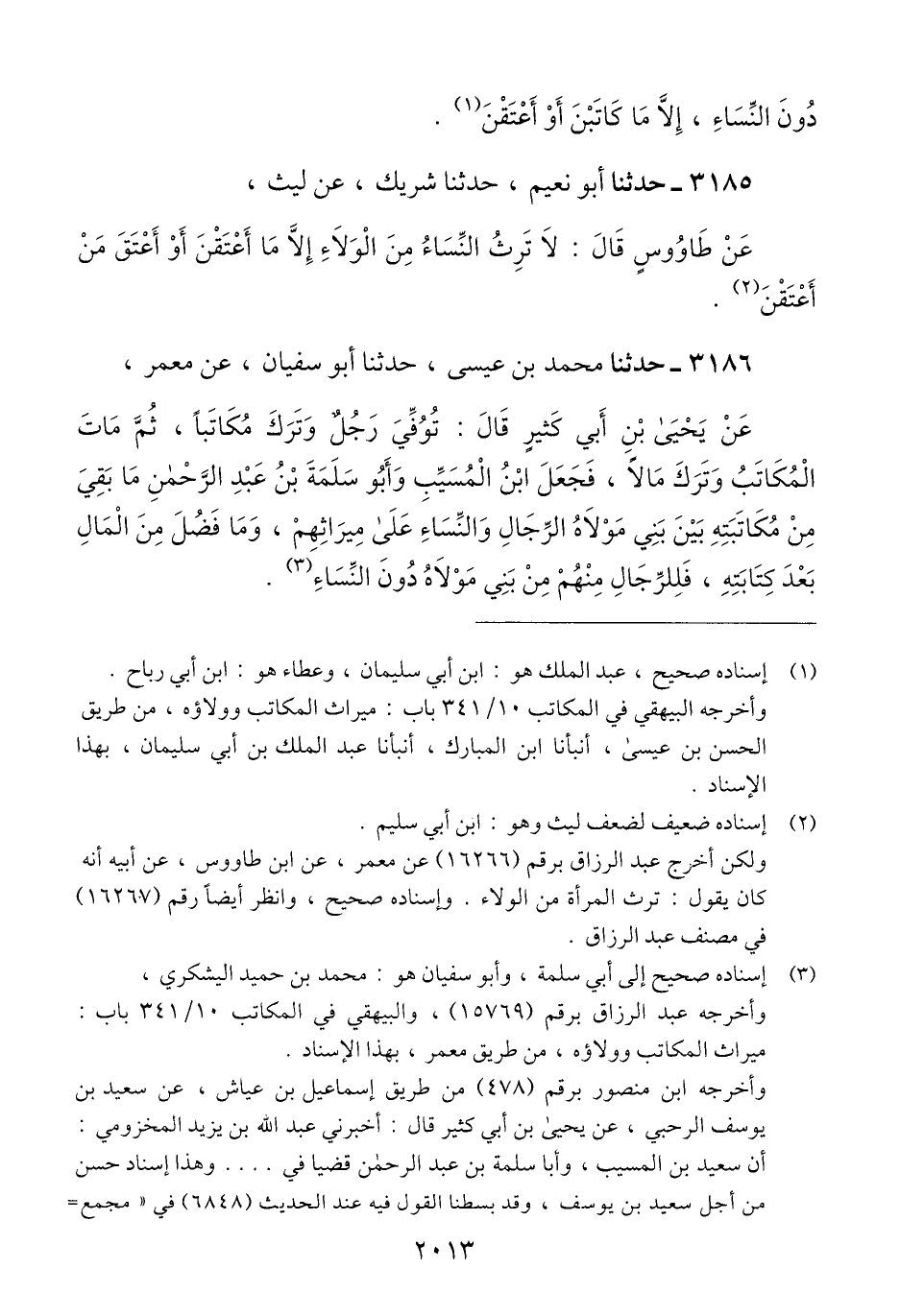 3186 - حَدَّثَنَا مُحَمَّدُ بْنُ عِيسَى، حَدَّثَنَا أَبُو سُفْيَانَ، عَنْ مَعْمَرٍ، عَنْ يَحْيَى بْنِ أَبِي كَثِيرٍ، قَالَ: «§تُوُفِّيَ رَجُلٌ وَتَرَكَ مُكَاتَبًا، ثُمَّ مَاتَ الْمُكَاتَبُ وَتَرَكَ مَالًا، فَجَعَلَ ابْنُ الْمُسَيَّبِ، وَأَبُو سَلَمَةَ بْنُ عَبْدِ الرَّحْمَنِ، مَا بَقِيَ مِنْ مُكَاتَبَتِهِ بَيْنَ بَنِي مَوْلَاهُ الرِّجَالُ وَالنِّسَاءُ عَلَى مِيرَاثِهِمْ، وَمَا فَضَلَ مِنَ الْمَالِ بَعْدَ كِتَابَتِهِ، فَلِلرِّجَالِ مِنْهُمْ مِنْ بَنِي مَوْلَاهُ دُونَ النِّسَاءِ» Qإسناده صحيح إلى أبي سلمة