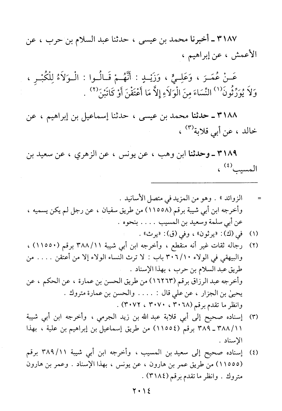 3190 - ح وحَدَّثَنَا ابْنُ أَبِي الزِّنَادِ، عَنْ أَبِيهِ، عَنْ سُلَيْمَانَ بْنِ يَسَارٍ، أَنَّهُمْ قَالُوا: «§لَا تَرِثُ النِّسَاءُ مِنَ الْوَلَاءِ إِلَّا مَا أَعْتَقْنَ أَوْ كَاتَبْنَ» Qالحديث إسناده صحيح إلى أبي قلابة عبد الله بن زيد الجرمي واسناده صحيح أيضا إلى سعيد بن المسيب أما من طريق ابن الزناد اسناده حسن