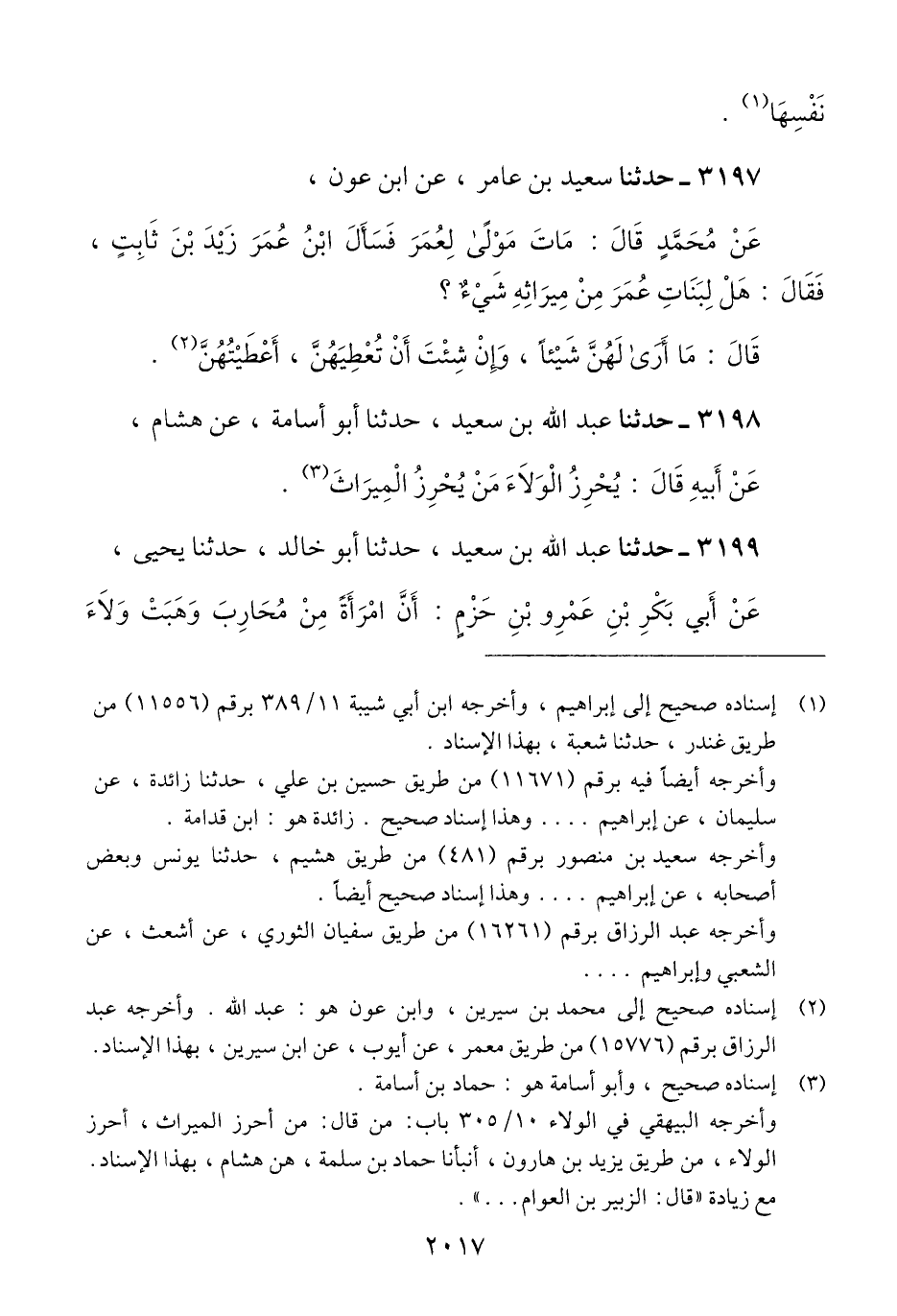 3197 - حَدَّثَنَا سَعِيدُ بْنُ عَامِرٍ، عَنْ ابْنِ عَوْنٍ، عَنْ مُحَمَّدٍ، قَالَ: مَاتَ مَوْلًى لِعُمَرَ فَسَأَلَ ابْنُ عُمَرَ، زَيْدَ بْنَ ثَابِتٍ، فَقَالَ: هَلْ لِبَنَاتِ عُمَرَ مِنْ مِيرَاثِهِ شَيْءٌ؟ قَالَ: «§مَا أَرَى لَهُنَّ شَيْئًا، وَإِنْ شِئْتَ أَنْ تُعْطِيَهُنَّ، أَعْطَيْتَهُنَّ» Qإسناده صحيح إلى محمد بن سرين