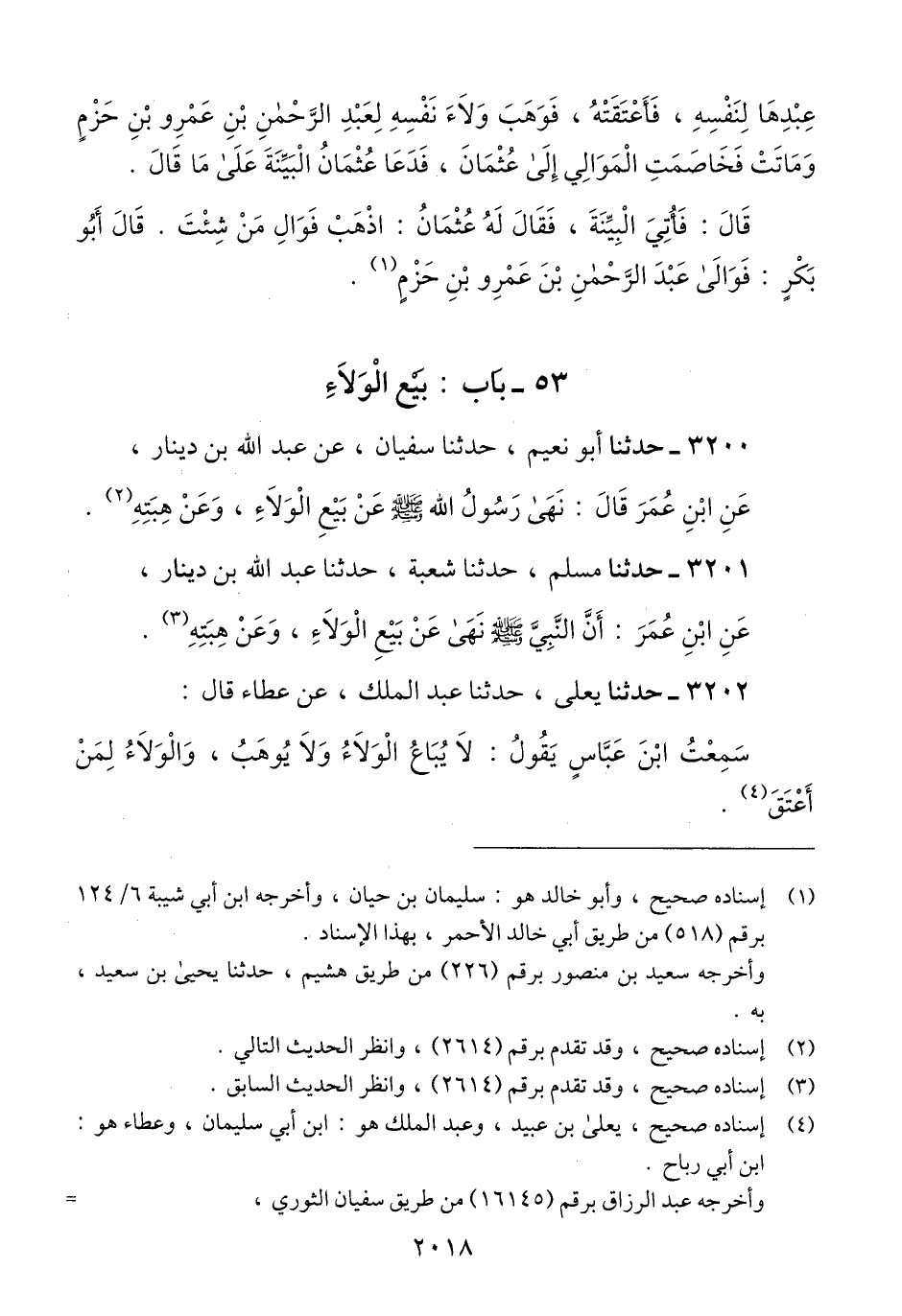 3200 - حَدَّثَنَا أَبُو نُعَيْمٍ، حَدَّثَنَا سُفْيَانُ، عَنْ عَبْدِ اللَّهِ بْنِ دِينَارٍ، عَنْ ابْنِ عُمَرَ، قَالَ: «§نَهَى رَسُولُ اللَّهِ صَلَّى اللهُ عَلَيْهِ وَسَلَّمَ عَنْ بَيْعِ الْوَلَاءِ، وَعَنْ هِبَتِهِ» Qإسناده صحيح