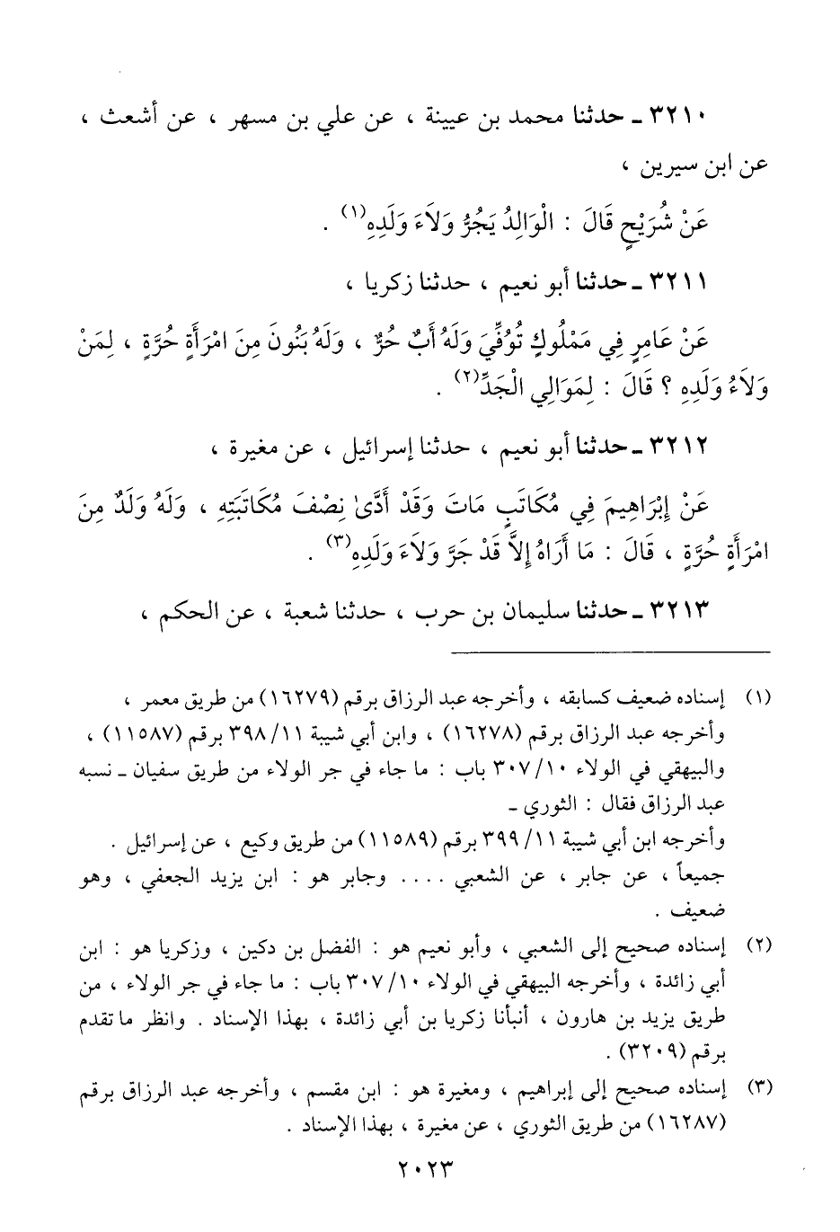 3211 - حَدَّثَنَا أَبُو نُعَيْمٍ، حَدَّثَنَا زَكَرِيَّا، عَنْ عَامِرٍ، فِي §مَمْلُوكٍ تُوُفِّيَ وَلَهُ أَبٌ حُرٌّ، وَلَهُ بَنُونَ مِنَ امْرَأَةٍ حُرَّةٍ، لِمَنْ وَلَاءُ وَلَدِهِ؟ قَالَ: «لِمَوَالِي الْجَدِّ» Qإسناده صحيح إلى الشعبي