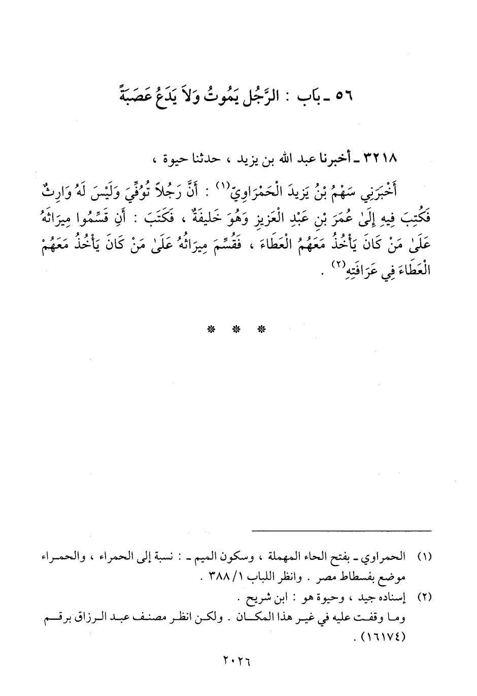 3218 - أَخْبَرَنَا عَبْدُ اللَّهِ بْنُ يَزِيدَ، حَدَّثَنَا حَيْوَةُ، أَخْبَرَنِي سَهْمُ بْنُ يَزِيدَ الْحَمْرَاوِيُّ: أن رَجُلًا تُوُفِّيَ وَلَيْسَ لَهُ وَارِثٌ فَكُتِبَ فِيهِ إِلَى عُمَرَ بْنِ عَبْدِ الْعَزِيزِ - وَهُوَ خَلِيفَةٌ - فَكَتَبَ: «أَنْ §قسِمُوا مِيرَاثَهُ عَلَى مَنْ كَانَ يَأْخُذُ مَعَهُمُ الْعَطَاءَ»، فَقُسِمَ مِيرَاثُهُ عَلَى مَنْ كَانَ يَأْخُذُ مَعَهُمُ الْعَطَاءَ فِي عِرَافَتِهِQإسناده جيد