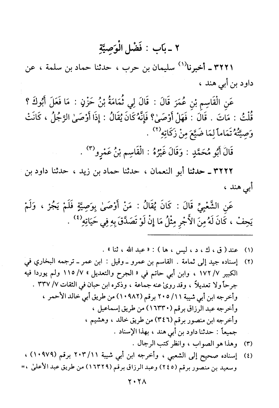 3222 - حَدَّثَنَا أَبُو النُّعْمَانِ، حَدَّثَنَا حَمَّادُ بْنُ زَيْدٍ، حَدَّثَنَا دَاوُدُ بْنُ أَبِي هِنْدٍ، عَنْ الشَّعْبِيِّ، قَالَ: " كَانَ يُقَالُ: §مَنْ أَوْصَى بِوَصِيَّةٍ فَلَمْ يَجُرْ، وَلَمْ يَحِفْ، كَانَ لَهُ مِنَ الْأَجْرِ مِثْلُ مَا إنْ لَوْ تَصَدَّقَ بِهِ فِي حَيَاتِهِ "Qإسناده صحيح إلى الشعبي