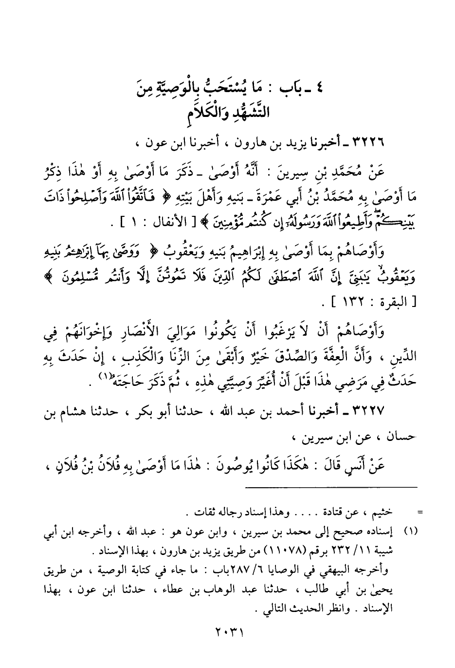 3226 - أَخْبَرَنَا يَزِيدُ بْنُ هَارُونَ، أَخْبَرَنَا ابْنُ عَوْنٍ، عَنْ مُحَمَّدِ بْنِ سِيرِينَ: " أَنَّهُ §أَوْصَى - ذِكْرُ مَا أَوْصَى بِهِ أَوْ هَذَا ذِكْرُ مَا أَوْصَى بِهِ مُحَمَّدُ بْنُ أَبِي عَمْرَةَ - بَنِيهِ وَأَهْلَ بَيْتِهِ أَنْ {اتَّقُوا اللَّهَ وَأَصْلِحُوا ذَاتَ بَيْنِكُمْ وَأَطِيعُوا اللَّهَ وَرَسُولَهُ إِنْ كُنْتُمْ مُؤْمِنِينَ}. وَأَوْصَاهُمْ بِمَا أَوْصَى بِهِ إِبْرَاهِيمُ بَنِيهِ وَيَعْقُوبُ {يَا بَنِيَّ إِنَّ اللَّهَ اصْطَفَى لَكُمُ الدِّينَ فَلَا تَمُوتُنَّ إِلَّا وَأَنْتُمْ مُسْلِمُونَ} [البقرة: 132]. وَأَوْصَاهُمْ أَنْ لَا يَرْغَبُوا أَنْ يَكُونُوا مَوَالِيَ الْأَنْصَارِ وَإِخْوَانَهُمْ فِي الدِّينِ، وَأَنَّ الْعِفَّةَ وَالصِّدْقَ خَيْرٌ وَأَتْقَى مِنَ الزِّنَا وَالْكَذِبِ، إِنْ حَدَثَ بِهِ حَدَثٌ فِي مَرَضِي هَذَا قَبْلَ أَنْ أُغَيِّرَ وَصِيَّتِي هَذِهِ، ثُمَّ ذَكَرَ حَاجَتَهُ "Qإسناده صحيح إلى محمد بن سيرين