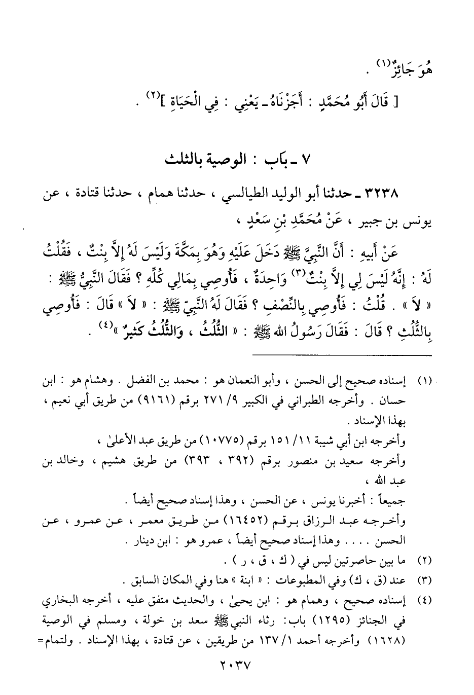 3238 - حَدَّثَنَا أَبُو الْوَلِيدِ الطَّيَالِسِيُّ، حَدَّثَنَا هَمَّامٌ، حَدَّثَنَا قَتَادَةُ، عَنْ يُونُسَ بْنِ جُبَيْرٍ، عَنْ مُحَمَّدِ بْنِ سَعْدٍ، عَنْ أَبِيهِ، أَنَّ النَّبِيَّ صَلَّى اللهُ عَلَيْهِ وَسَلَّمَ دَخَلَ عَلَيْهِ وَهُوَ بِمَكَّةَ وَلَيْسَ لَهُ إِلَّا ابْنَةٌ، فَقُلْتُ لَهُ: إِنَّهُ لَيْسَ لِي إِلَّا ابْنَةٌ وَاحِدَةٌ، فَأُوصِي بِمَالِي كُلِّهِ؟ فَقَالَ النَّبِيُّ صَلَّى اللهُ عَلَيْهِ وَسَلَّمَ: «لَا». قُلْتُ: فَأُوصِي بِالنِّصْفِ؟ فَقَالَ لَهُ النَّبِيُّ صَلَّى اللهُ عَلَيْهِ وَسَلَّمَ: «لَا». قَالَ: فَأُوصِي بِالثُّلُثِ؟ قَالَ: فَقَالَ رَسُولُ اللَّهِ صَلَّى اللهُ عَلَيْهِ وَسَلَّمَ: «§الثُّلُثُ، وَالثُّلُثُ كَثِيرٌ» Qإسناده صحيح