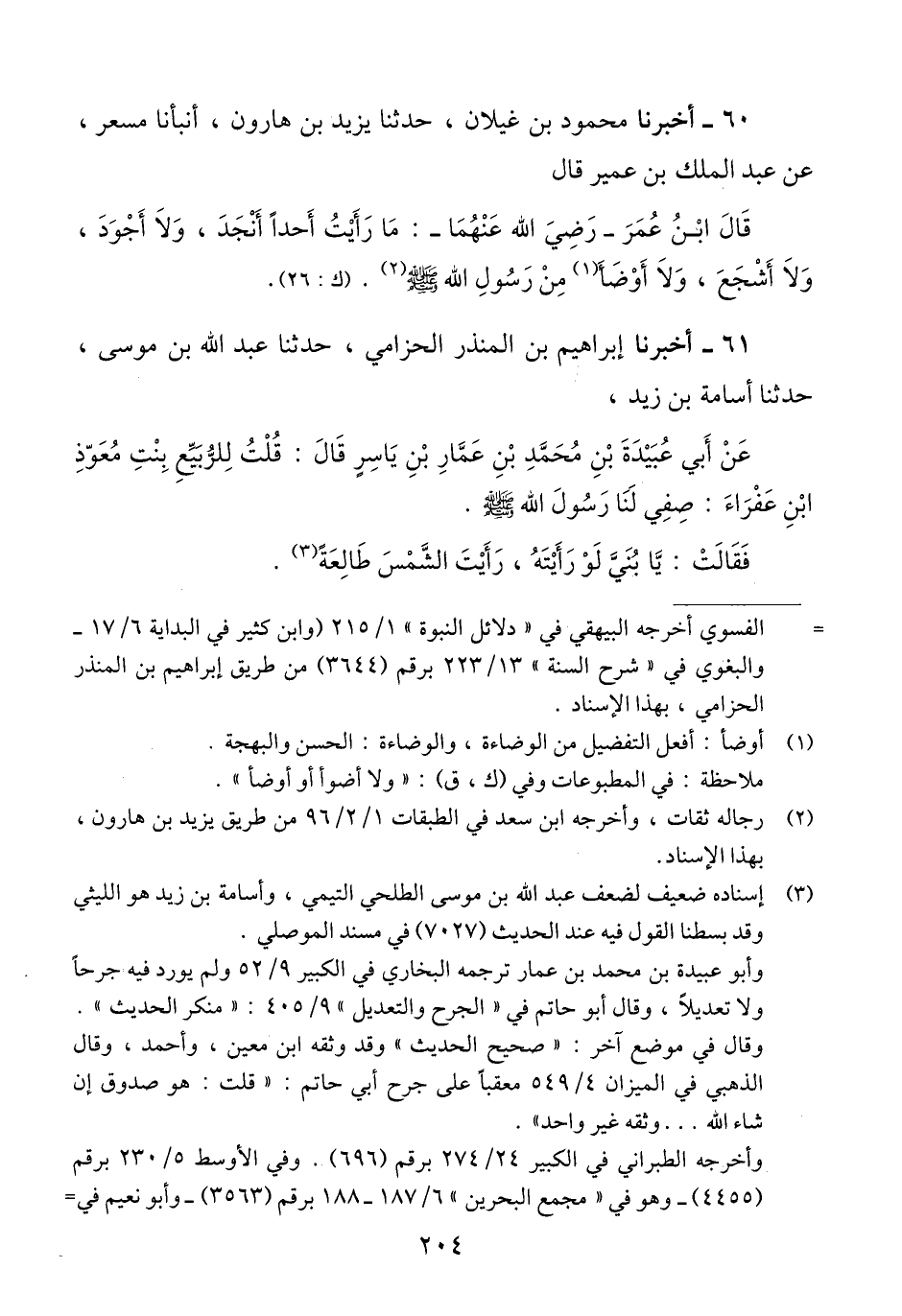 61 - أَخْبَرَنَا إِبْرَاهِيمُ بْنُ الْمُنْذِرِ الْحِزَامِيُّ، حَدَّثَنَا عُبَيْدُ اللَّهِ بْنُ مُوسَى، حَدَّثَنَا أُسَامَةُ بْنُ زَيْدٍ، عَنْ أَبِي عُبَيْدَةَ بْنِ مُحَمَّدِ بْنِ عَمَّارِ بْنِ يَاسِرٍ، قَالَ: قُلْتُ لِلرُّبَيِّعِ بِنْتِ مُعَوِّذِ ابْنِ عَفْرَاءَ: " صِفِي لَنَا رَسُولَ اللَّهِ صَلَّى اللهُ عَلَيْهِ وَسَلَّمَ فَقَالَتْ: يَا بُنَيَّ §لَوْ رَأَيْتَهُ، رَأَيْتَ الشَّمْسَ طَالِعَةً "Qإسناده ضعيف لضعف عبد الله بن موسى الطلحي التيمي