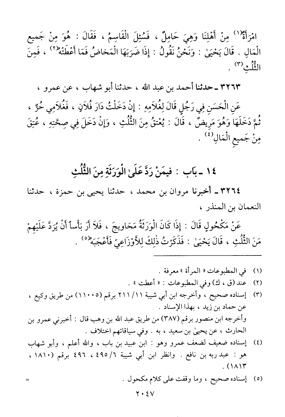 3264 - أخبرنا مَرْوَانُ بْنُ مُحَمَّدٍ، حَدَّثَنَا يَحْيَى بْنُ حَمْزَةَ، حَدَّثَنَا النُّعْمَانُ بْنُ الْمُنْذِرِ، عَنْ مَكْحُولٍ، قَالَ: «§إِذَا كَانَ الْوَرَثَةُ مَحَاوِيجَ، فَلَا أَرَى بَأْسًا أَنْ يُرَدَّ عَلَيْهِمْ مِنَ الثُّلُثِ» قَالَ يَحْيَى: «فَذَكَرْتُ ذَلِكَ لِلْأَوْزَاعِيِّ فَأَعْجَبَهُ» Qإسناده صحيح وما وقفت على كلام مكحول