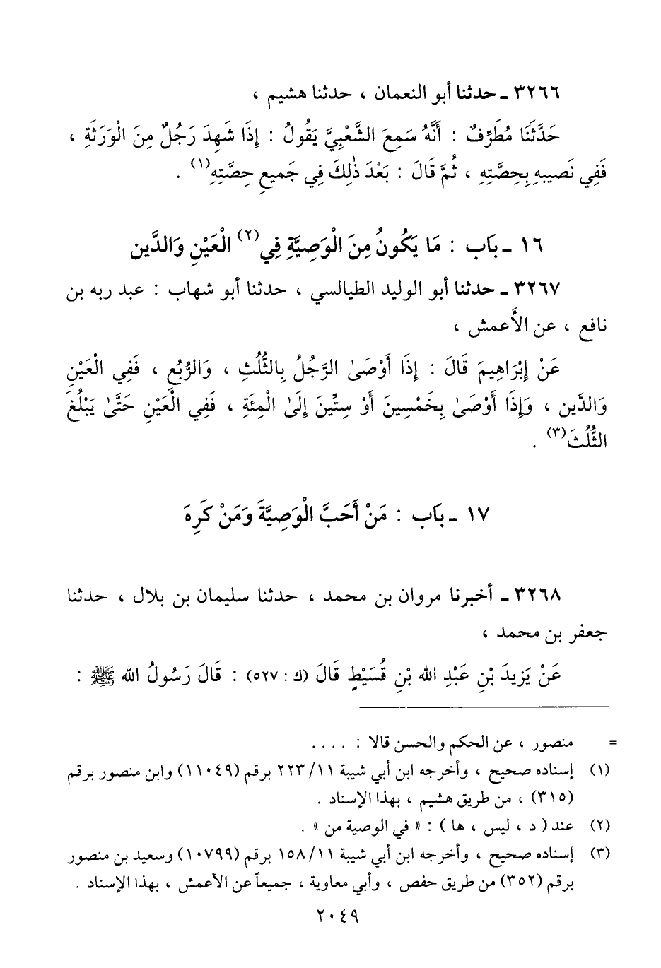 3266 - حَدَّثَنَا أَبُو النُّعْمَانِ، حَدَّثَنَا هُشَيْمٌ، حَدَّثَنَا مُطَرِّفٌ: أَنَّهُ سَمِعَ الشَّعْبِيَّ، يَقُولُ: «§إِذَا شَهِدَ رَجُلٌ مِنَ الْوَرَثَةِ، فَفِي نَصِيبِهِ بِحِصَّتِهِ» ثُمَّ قَالَ: «بَعْدَ ذَلِكَ فِي جَمِيعِ حِصَّتِهِ» Qإسناده صحيح