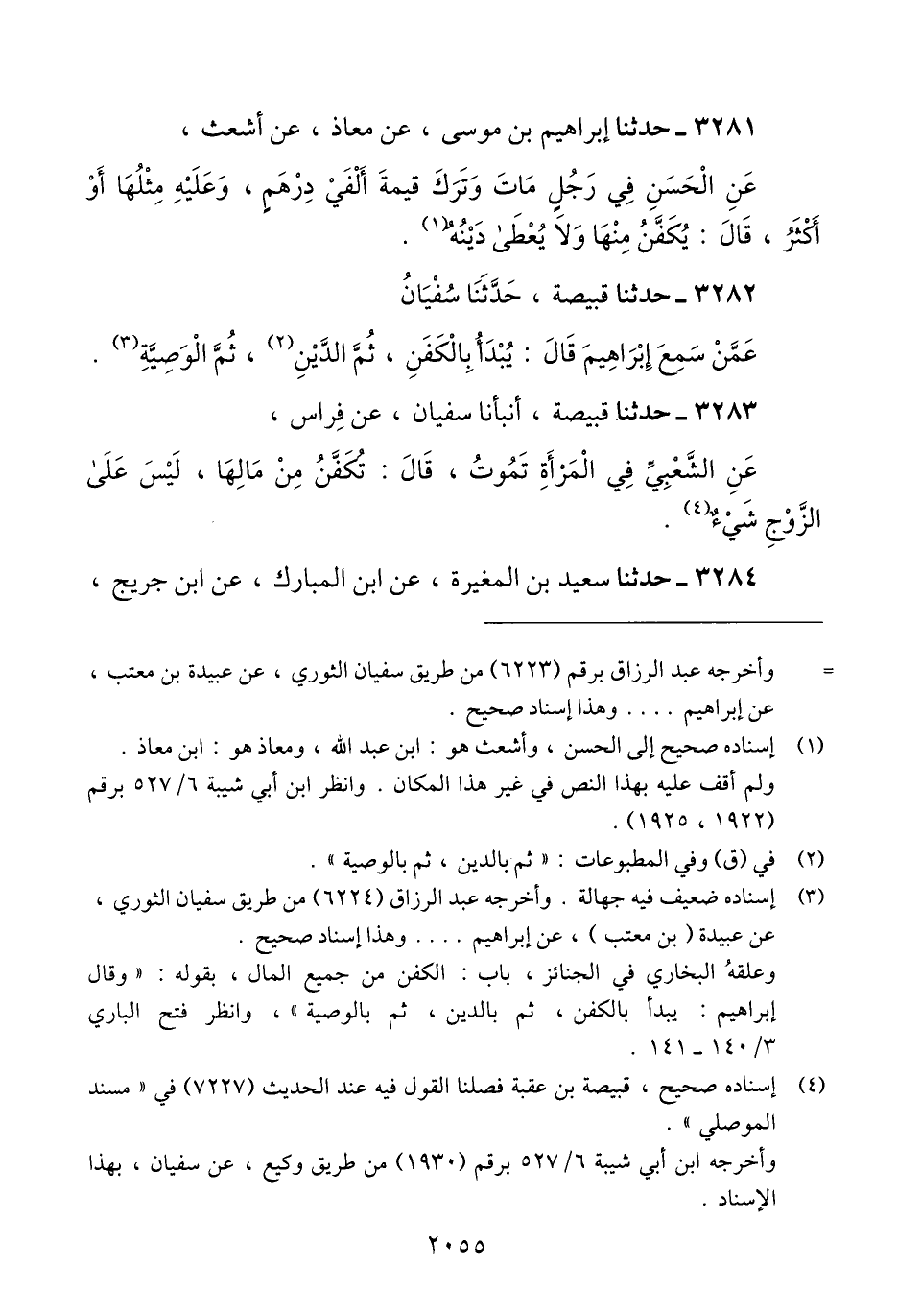3282 - حَدَّثَنَا قَبِيصَةُ، حَدَّثَنَا سُفْيَانُ، عَمَّنْ، سَمِعَ إِبْرَاهِيمَ، قَالَ: «§يُبْدَأُ بِالْكَفَنِ، ثُمَّ الدَّيْنِ، ثُمَّ الْوَصِيَّةِ» Qإسناده ضعيف فيه جهالة