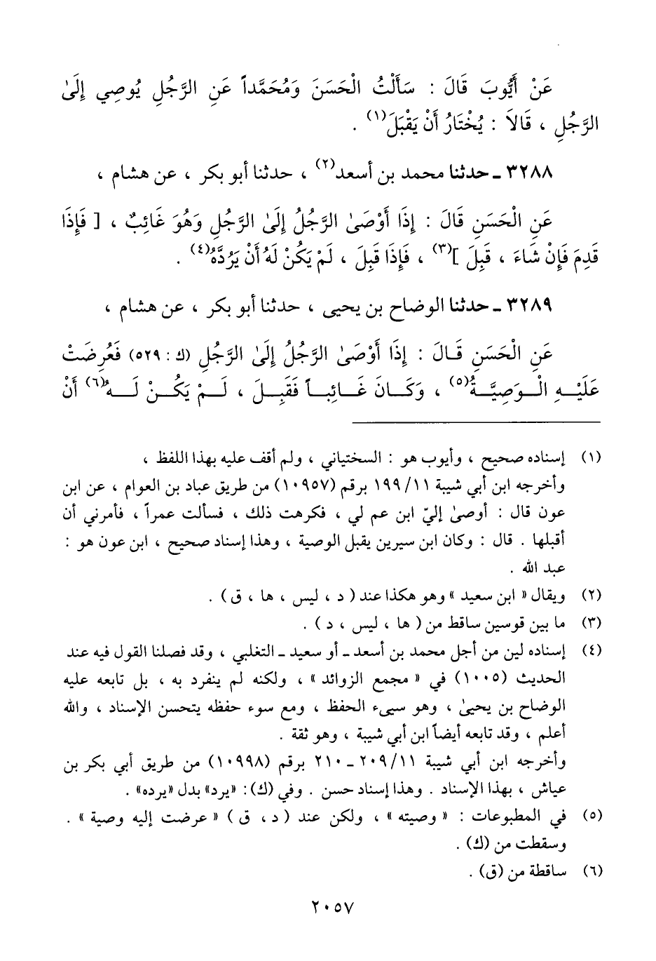 3289 - حَدَّثَنَا الْوَضَّاحُ بْنُ يَحْيَى، حَدَّثَنَا أَبُو بَكْرٍ، عَنْ هِشَامٍ، عَنْ الْحَسَنِ، قَالَ: «§إِذَا أَوْصَى الرَّجُلُ إِلَى الرَّجُلِ فَعُرِضَتْ عَلَيْهِ الْوَصِيَّةُ، وَكَانَ غَائِبًا فَقَبِلَ، لَمْ يَكُنْ لَهُ أَنْ -[2058]- يَرْجِعَ» Qالوضاح بن يحيى سيئ الحفظ ولكنه متابع عليه