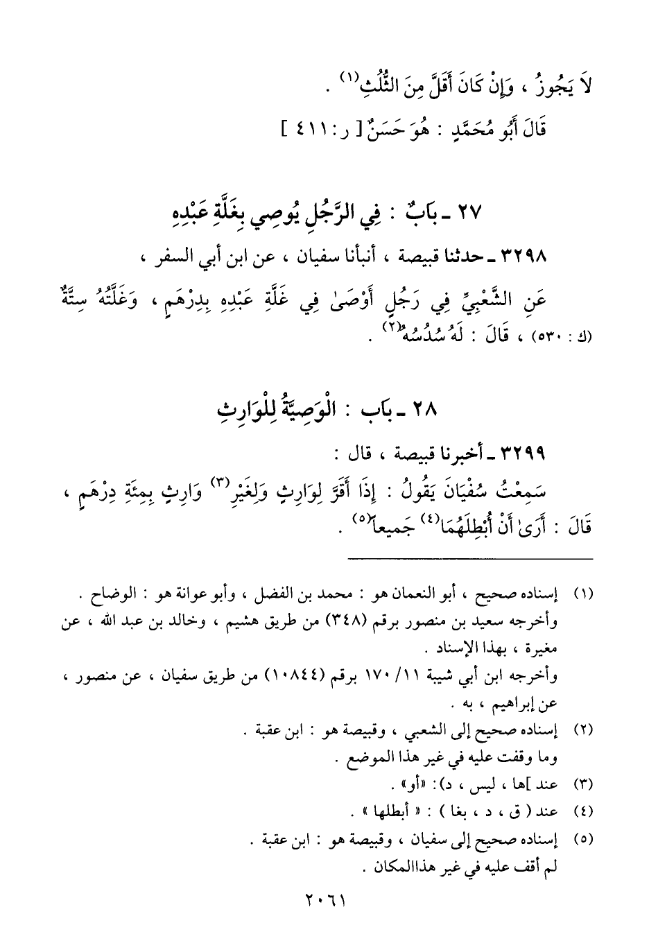 3298 - حَدَّثَنَا قَبِيصَةُ، أََنْبَأَنَا سُفْيَانُ، عَنْ ابْنِ أَبِي السَّفَرِ، عَنْ الشَّعْبِيِّ، فِي رَجُلٍ §أَوْصَى فِي غَلَّةِ عَبْدِهِ بِدِرْهَمٍ، وَغَلَّتُهُ سِتَّةٌ، قَالَ: «لَهُ سُدُسُهُ» Qإسناده صحيح إلى الشعبي