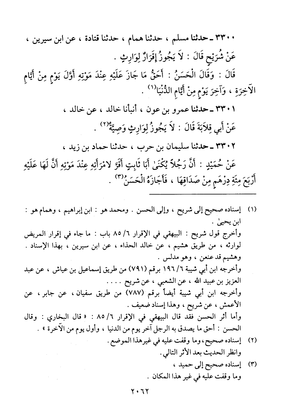3300 - حَدَّثَنَا مُسْلِمٌ، حَدَّثَنَا هَمَّامٌ، حَدَّثَنَا قَتَادَةُ، عَنْ ابْنِ سِيرِينَ، عَنْ شُرَيْحٍ، قَالَ: «§لَا يَجُوزُ إِقْرَارٌ لِوَارِثٍ» قَالَ: وَقَالَ الْحَسَنُ: «أَحَقُّ مَا جَازَ عَلَيْهِ عِنْدَ مَوْتِهِ أَوَّلَ يَوْمٍ مِنْ أَيَّامِ الْآخِرَةِ، وَآخِرَ يَوْمٍ مِنْ أَيَّامِ الدُّنْيَا» Qإسناده صحيح إلى شريح وإلى الحسن