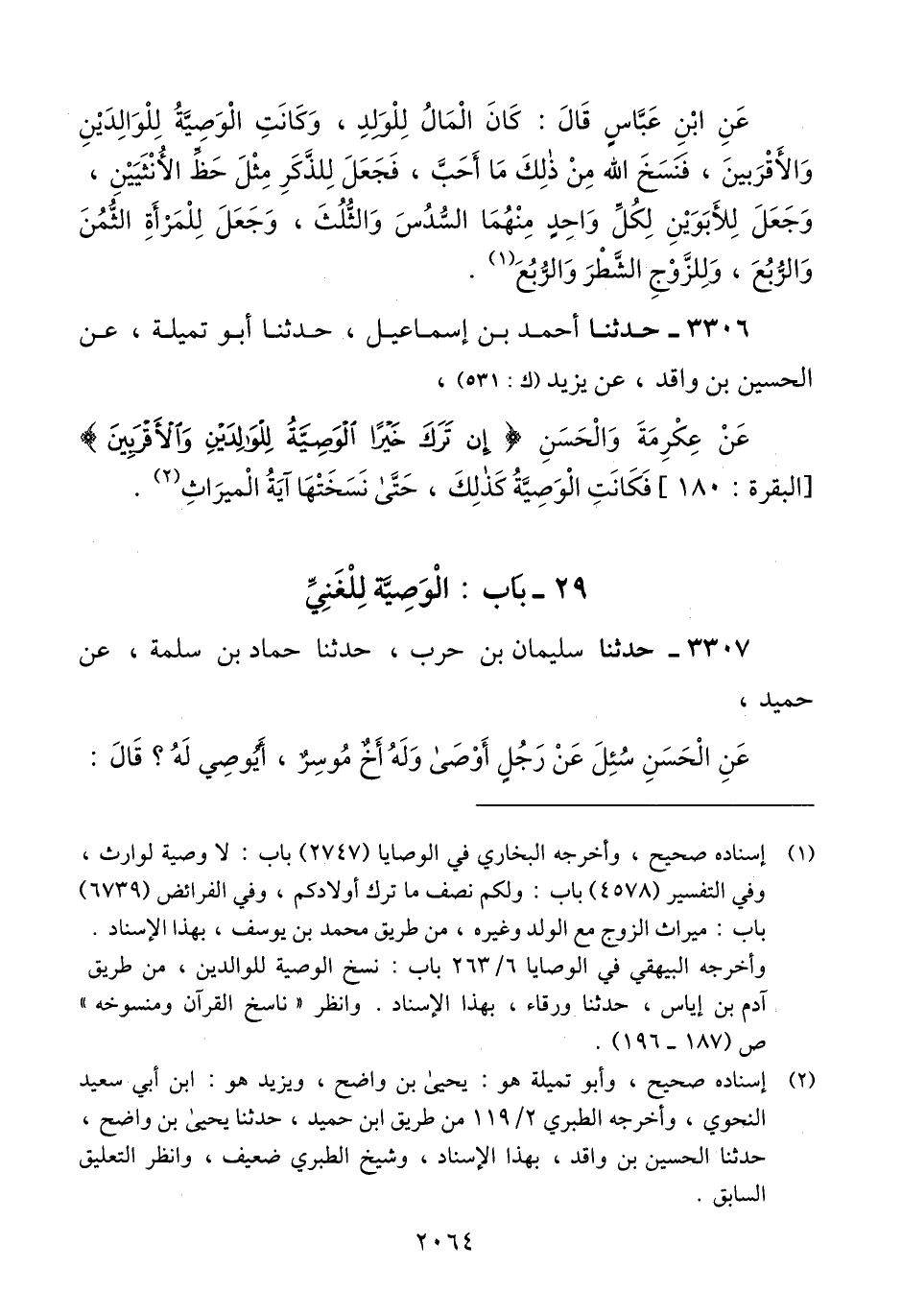 3306 - حَدَّثَنَا أَحْمَدُ بْنُ إِسْمَاعِيلَ، حَدَّثَنَا أَبُو تُمَيْلَةَ، عَنْ الْحُسَيْنِ بْنِ وَاقِدٍ، عَنْ يَزِيدَ، عَنْ عِكْرِمَةَ، وَالْحَسَنِ، {§إِنْ تَرَكَ خَيْرًا الْوَصِيَّةُ لِلْوَالِدَيْنِ وَالْأَقْرَبِينَ} [البقرة: 180] «فكَانَتِ الْوَصِيَّةُ كَذَلِكَ، حَتَّى نَسَخَتْهَا آيَةُ الْمِيرَاثِ» Qإسناده صحيح