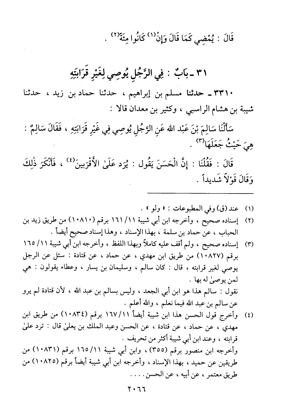 3310 - حَدَّثَنَا مُسْلِمُ بْنُ إِبْرَاهِيمَ، حَدَّثَنَا حَمَّادُ بْنُ زَيْدٍ، حَدَّثَنَا شَيْبَةُ بْنُ هِشَامٍ الرَّاسِبِيُّ، وَكَثِيرُ بْنُ مَعْدَانَ، قَالَا: سَأَلْنَا سَالِمَ بْنَ عَبْدِ اللَّهِ عَنِ الرَّجُلِ §يُوصِي فِي غَيْرِ قَرَابَتِهِ، فَقَالَ سَالِمٌ: «هِيَ حَيْثُ جَعَلَهَا»، قَالَ: فَقُلْنَا: إِنَّ الْحَسَنَ، يَقُولُ: «يُرَدُّ عَلَى الْأَقْرَبِينَ»، فَأَنْكَرَ ذَلِكَ وَقَالَ قَوْلًا شَدِيدًاQإسناده صحيح ولم أقف عليه كاملا وبهذا اللفظ