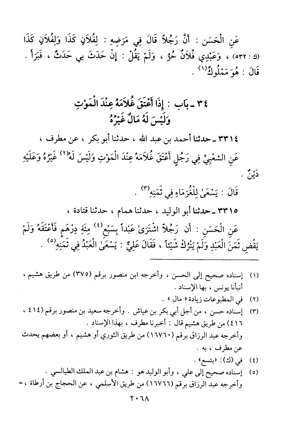 3314 - حَدَّثَنَا أَحْمَدُ بْنُ عَبْدِ اللَّهِ، حَدَّثَنَا أَبُو بَكْرٍ، عَنْ مُطَرِّفٍ، عَنْ الشَّعْبِيِّ، فِي رَجُلٍ §أَعْتَقَ غُلَامَهُ عِنْدَ الْمَوْتِ وَلَيْسَ لَهُ غَيْرُهُ وَعَلَيْهِ دَيْنٌ، قَالَ: «يَسْعَى لِلْغُرَمَاءِ فِي ثَمَنِهِ» Qإسناده حسن من أجل أبي بكر بن عياش