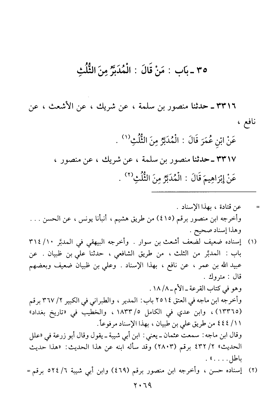 3316 - حَدَّثَنَا مَنْصُورُ بْنُ سَلَمَةَ، عَنْ شَرِيكٍ، عَنْ الْأَشْعَثِ، عَنْ نَافِعٍ، عَنْ ابْنِ عُمَرَ، قَالَ: «§الْمُدَبَّرُ مِنَ الثُّلُثِ» Qإسناده ضعيف لضعف أشعث بن سوار