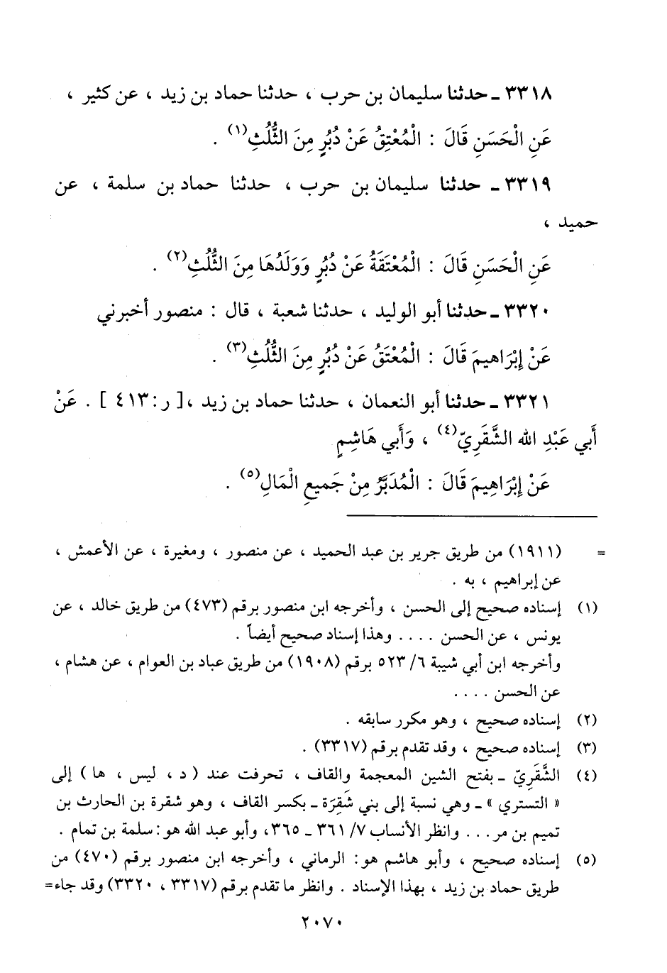 3318 - حَدَّثَنَا سُلَيْمَانُ بْنُ حَرْبٍ، حَدَّثَنَا حَمَّادُ بْنُ زَيْدٍ، عَنْ كَثِيرٍ، عَنْ الْحَسَنِ، قَالَ: «§الْمُعْتَقُ عَنْ دُبُرٍ مِنَ الثُّلُثِ» Qإسناده صحيح إلى الحسن