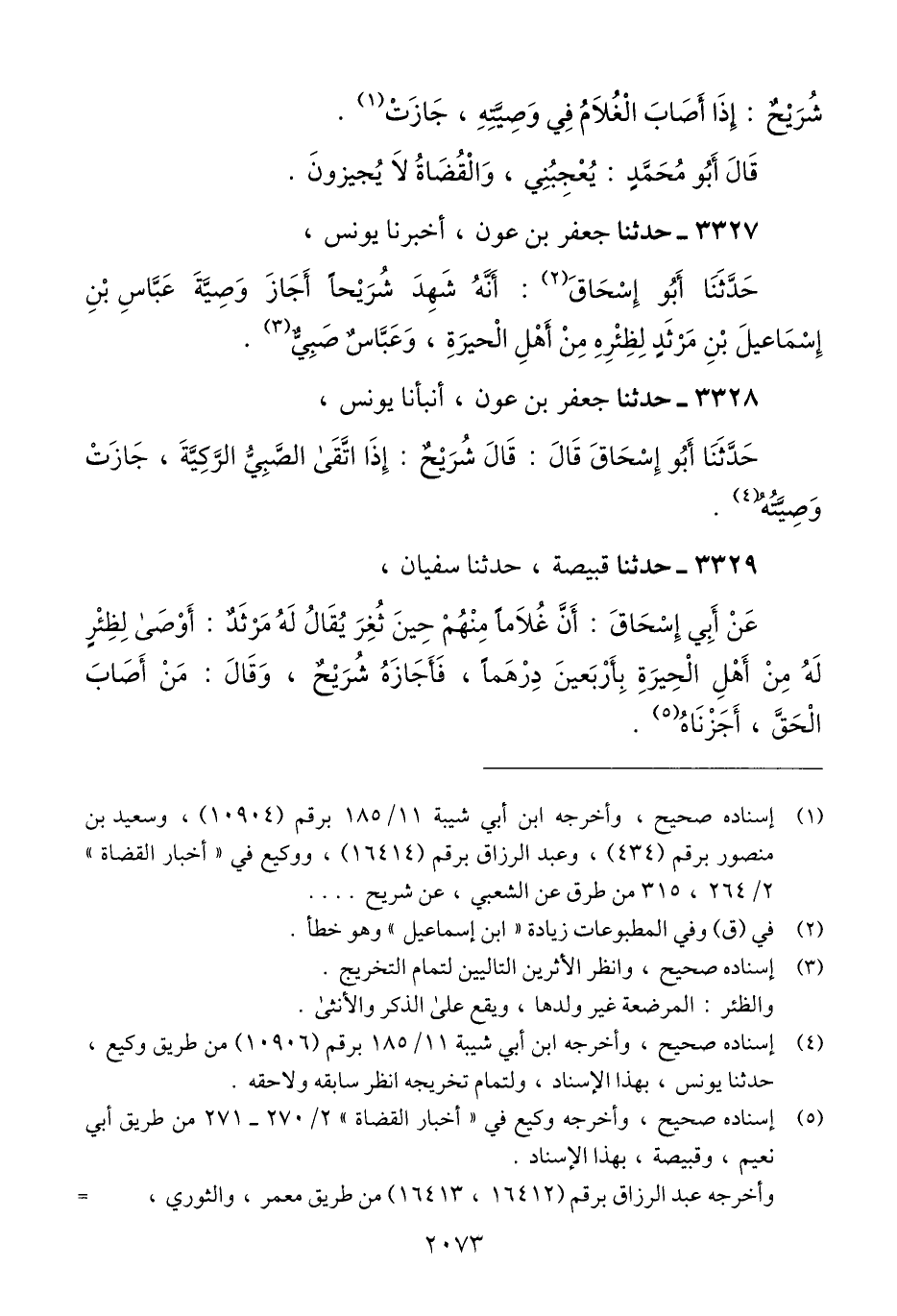 3327 - حَدَّثَنَا جَعْفَرُ بْنُ عَوْنٍ، أَخْبَرَنَا يُونُسُ، حَدَّثَنَا أَبُو إِسْحَاقَ: أَنَّهُ «شَهِدَ شُرَيْحًا، §أَجَازَ وَصِيَّةَ عَبَّاسِ بْنِ إِسْمَاعِيلَ بْنِ مَرْثَدٍ لِظِئْرِهِ مِنْ أَهْلِ الْحِيرَةِ، وعَبَّاسٌ صَبِيٌّ» Qإسناده صحيح