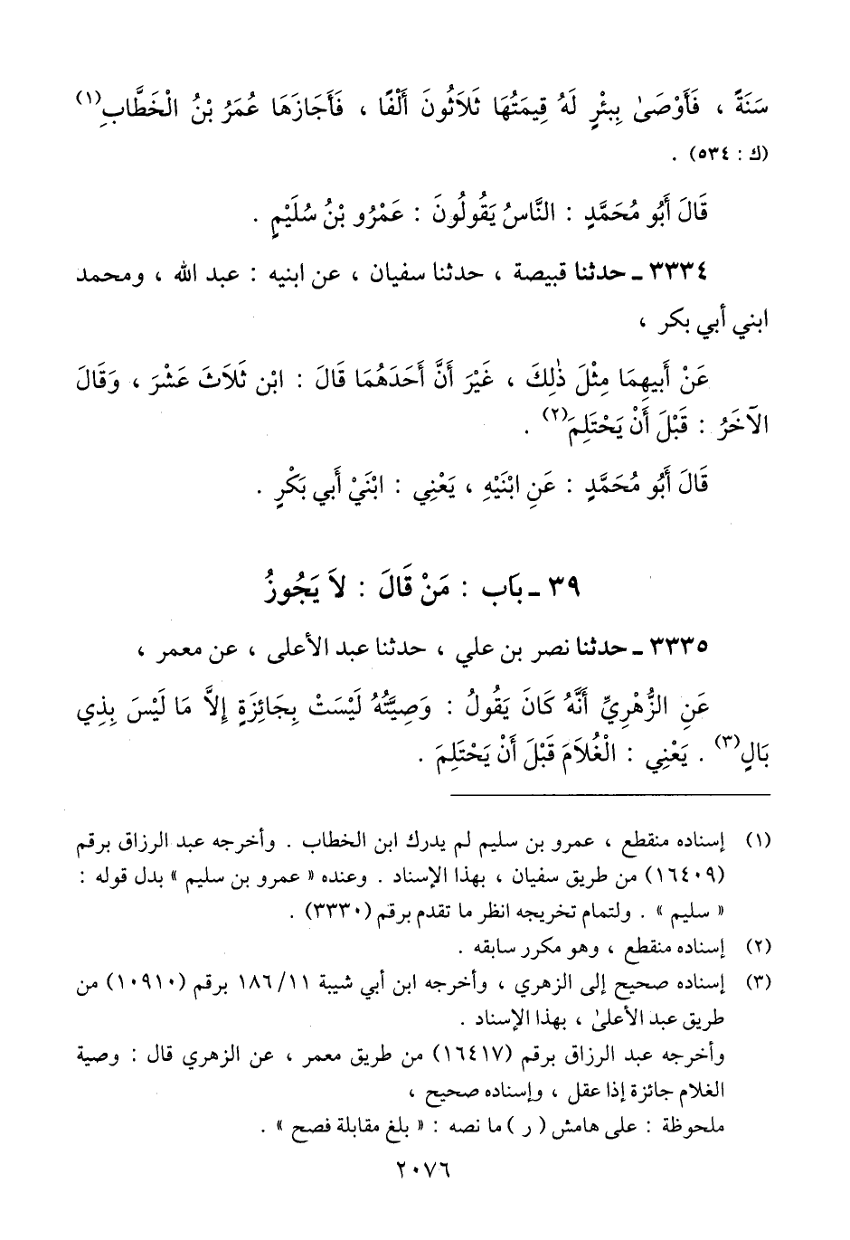 3335 - حَدَّثَنَا نَصْرُ بْنُ عَلِيٍّ، حَدَّثَنَا عَبْدُ الْأَعْلَى، عَنْ مَعْمَرٍ، عَنْ الزُّهْرِيِّ، أَنَّهُ كَانَ يَقُولُ: «§وَصِيَّتُهُ لَيْسَتْ بِجَائِزَةٍ إِلَّا مَا لَيْسَ بِذِي بَالٍ» يَعْنِي: الْغُلَامَ قَبْلَ أَنْ يَحْتَلِمَQإسناده صحيح إلى الزهري