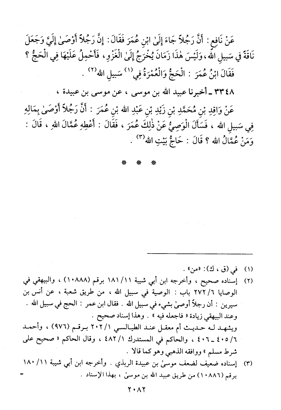 3348 - أَخْبَرَنَا عُبَيْدُ اللَّهِ بْنُ مُوسَى، عَنْ مُوسَى بْنِ عُبَيْدَةَ، عَنْ وَاقِدِ بْنِ مُحَمَّدِ بْنِ زَيْدٍ، عَنْ عَبْدِ اللَّهِ بْنِ عُمَرَ: أَنَّ رَجُلًا §أَوْصَى بِمَالِهِ فِي سَبِيلِ اللَّهِ، فَسَأَلَ الْوَصِيُّ عَنْ ذَلِكَ عُمَرَ، فَقَالَ: «أَعْطِهِ عُمَّالَ اللَّهِ»، قَالَ: وَمَنْ عُمَّالُ اللَّهِ؟ قَالَ: «حَاجُّ بَيْتِ اللَّهِ» Qإسناده ضعيف لضعف موسى بن عبيد الربذي