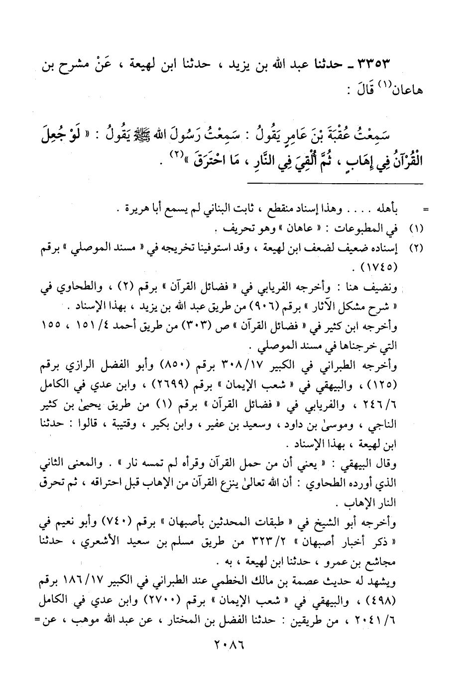 3353 - حَدَّثَنَا عَبْدُ اللَّهِ بْنُ يَزِيدَ، حَدَّثَنَا ابْنُ لَهِيعَةَ، عَنْ مِشْرَحِ بْنِ هَاعَانَ، قَالَ: سَمِعْتُ عُقْبَةَ بْنَ عَامِرٍ، يَقُولُ: سَمِعْتُ رَسُولَ اللَّهِ صَلَّى اللهُ عَلَيْهِ وَسَلَّمَ يَقُولُ: «§لَوْ جُعِلَ الْقُرْآنُ فِي إِهَابٍ، ثُمَّ أُلْقِيَ فِي النَّارِ، مَا احْتَرَقَ» Qإسناده ضعيف لضعف ابن لهيعة