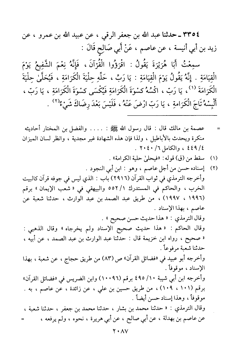 3354 - حَدَّثَنَا عَبْدُ اللَّهِ بْنُ جَعْفَرٍ الرَّقِّيُّ، عَنْ عُبَيْدِ اللَّهِ بْنِ عَمْرٍو، عَنْ زَيْدِ بْنِ أَبِي أُنَيْسَةَ، عَنْ عَاصِمٍ، عَنْ أَبِي صَالِحٍ، قَالَ: سَمِعْتُ أَبَا هُرَيْرَةَ، يَقُولُ: " §اقْرَءُوا الْقُرْآنَ، فَإِنَّهُ نِعْمَ الشَّفِيعُ يَوْمَ الْقِيَامَةِ. إِنَّهُ يَقُولُ يَوْمَ الْقِيَامَةِ: يَا رَبِّ، حَلِّهِ حِلْيَةَ الْكَرَامَةِ، فَيُحَلَّى حِلْيَةَ الْكَرَامَةِ، يَا رَبِّ، اكْسُهُ كِسْوَةَ الْكَرَامَةِ فَيُكْسَى كِسْوَةَ الْكَرَامَةِ، يَا رَبِّ، أَلْبِسْهُ تَاجَ الْكَرَامَةِ، يَا رَبِّ ارْضَ عَنْهُ، فَلَيْسَ بَعْدَ رِضَاكَ شَيْءٌ "Qإسناده حسن من أجل عاصم وهو: ابن أبي النجود