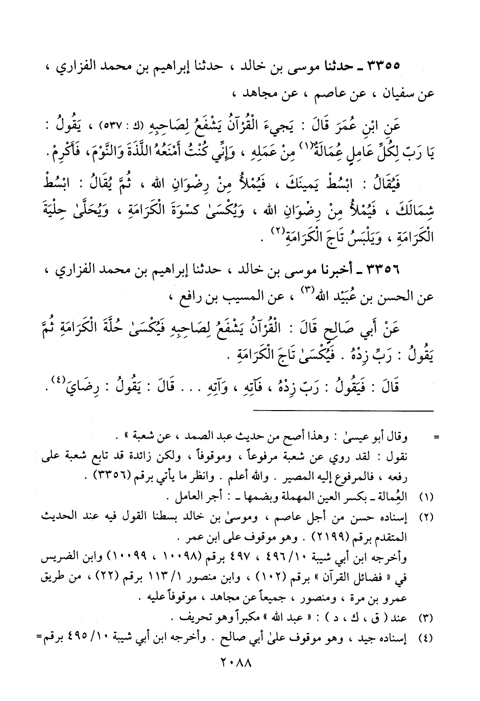 3355 - حَدَّثَنَا مُوسَى بْنُ خَالِدٍ، حَدَّثَنَا إِبْرَاهِيمُ بْنُ مُحَمَّدٍ الْفَزَارِيُّ، عَنْ سُفْيَانَ، عَنْ عَاصِمٍ، عَنْ مُجَاهِدٍ، عَنْ ابْنِ عُمَرَ، قَالَ: " §يَجِيءُ الْقُرْآنُ يَشْفَعُ لِصَاحِبِهِ، يَقُولُ: يَا رَبِّ لِكُلِّ عَامِلٍ عُمَالَةٌ مِنْ عَمَلِهِ، وَإِنِّي كُنْتُ أَمْنَعُهُ اللَّذَّةَ وَالنَّوْمَ، فَأَكْرِمْ. فَيُقَالُ: ابْسُطْ يَمِينَكَ، فَيُمْلَأُ مِنْ رِضْوَانِ اللَّهِ، ثُمَّ يُقَالُ: ابْسُطْ شِمَالَكَ، فَيمْلَأُ مِنْ رِضْوَانِ اللَّهِ، وَيُكْسَى كِسْوَةَ الْكَرَامَةِ، وَيُحَلَّى حِلْيَةِ الْكَرَامَةِ، وَيُلْبَسُ تَاجَ الْكَرَامَةِ "Qإسناده حسن من أجل عاصم