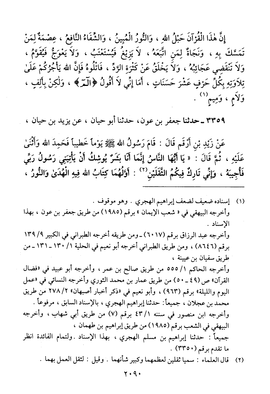 3359 - حَدَّثَنَا جَعْفَرُ بْنُ عَوْنٍ، حَدَّثَنَا أَبُو حَيَّانَ، عَنْ يَزِيدَ بْنِ حَيَّانَ، عَنْ زَيْدِ بْنِ أَرْقَمَ، قَالَ: قَامَ رَسُولُ اللَّهِ صَلَّى اللهُ عَلَيْهِ وَسَلَّمَ يَوْمًا خَطِيبًا فَحَمِدَ اللَّهَ وَأَثْنَى عَلَيْهِ، ثُمَّ قَالَ: " يَا أَيُّهَا النَّاسُ §إِنَّمَا أَنَا بَشَرٌ يُوشِكُ أَنْ يَأْتِيَنِي رَسُولُ رَبِّي فَأُجِيبَهُ، وَإِنِّي تَارِكٌ فِيكُمُ الثَّقَلَيْنِ: أَوَّلُهُمَا كِتَابُ اللَّهِ فِيهِ الْهُدَى وَالنُّورُ، -[2091]- فَتَمَسَّكُوا بِكِتَابِ اللَّهِ، وَخُذُوا بِهِ "، فَحَثَّ عَلَيْهِ وَرَغَّبَ فِيهِ، ثُمَّ قَالَ: «وَأَهْلَ بَيْتِي أُذَكِّرُكُمُ اللَّهَ فِي أَهْلِ بَيْتِي ثَلَاثَ مَرَّاتٍ» Qإسناده صحيح