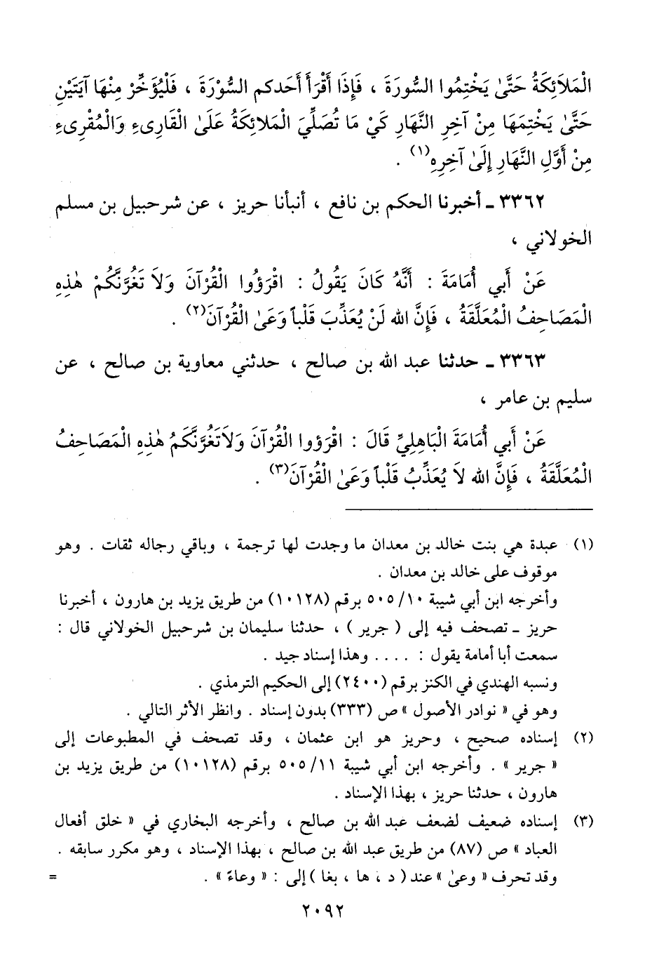 3363 - حَدَّثَنَا عَبْدُ اللَّهِ بْنُ صَالِحٍ، حَدَّثَنِي مُعَاوِيَةُ بْنُ صَالِحٍ، عَنْ سُلَيْمِ بْنِ عَامِرٍ، عَنْ أَبِي أُمَامَةَ الْبَاهِلِيِّ، قَالَ: «§اقْرَءُوا الْقُرْآنَ وَلَا تغُرَّنَّكُمْ هَذِهِ الْمَصَاحِفُ الْمُعَلَّقَةُ، فَإِنَّ اللَّهَ لَا يُعَذِّبُ قَلْبًا وَعَى الْقُرْآنَ» Qإسناده ضعيف لضعف عبد الله بن صالح