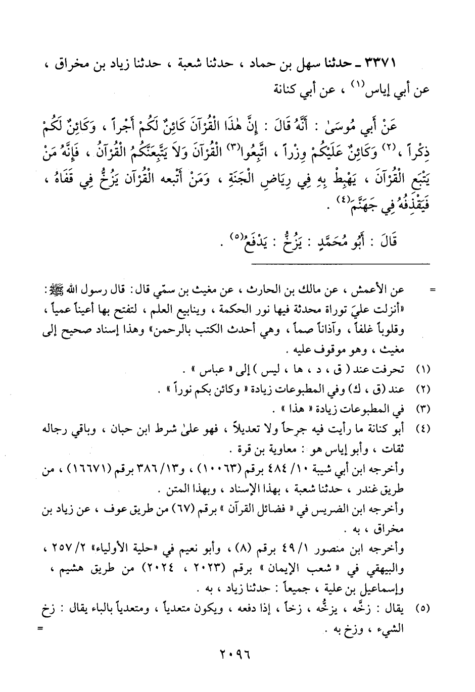 3371 - حَدَّثَنَا سَهْلُ بْنُ حَمَّادٍ، حَدَّثَنَا شُعْبَةُ، حَدَّثَنَا زِيَادُ بْنُ مِخْرَاقٍ، عَنْ أَبِي إِيَاسٍ، عَنْ أَبِي كِنَانَةَ، عَنْ أَبِي مُوسَى، أَنَّهُ قَالَ: «إِنَّ §هَذَا الْقُرْآنَ كَائِنٌ لَكُمْ أَجْرًا، وَكَائِنٌ لَكُمْ ذِكْرًا، وَكَائِنٌ عَلَيْكُمْ وِزْرًا، اتَّبِعُوا الْقُرْآنَ وَلَا يَتَّبِعْنكُمُ الْقُرْآنُ، فَإِنَّهُ مَنْ يَتَّبِعِ الْقُرْآنَ، يَهْبِطْ بِهِ فِي رِيَاضِ الْجَنَّةِ، وَمَنِ اتَّبَعَهُ الْقُرْآنُ يَزُخُّ فِي قَفَاهُ، فَيَقْذِفُهُ فِي جَهَنَّمَ» قَالَ أَبُو مُحَمَّد: " يَزُخُّ: يَدْفَعُ "Qأبو كنانة ما رأيت فيه جرحا ولا تعديلا فهو على شرط ابن حبان وباقي رجاله ثقات