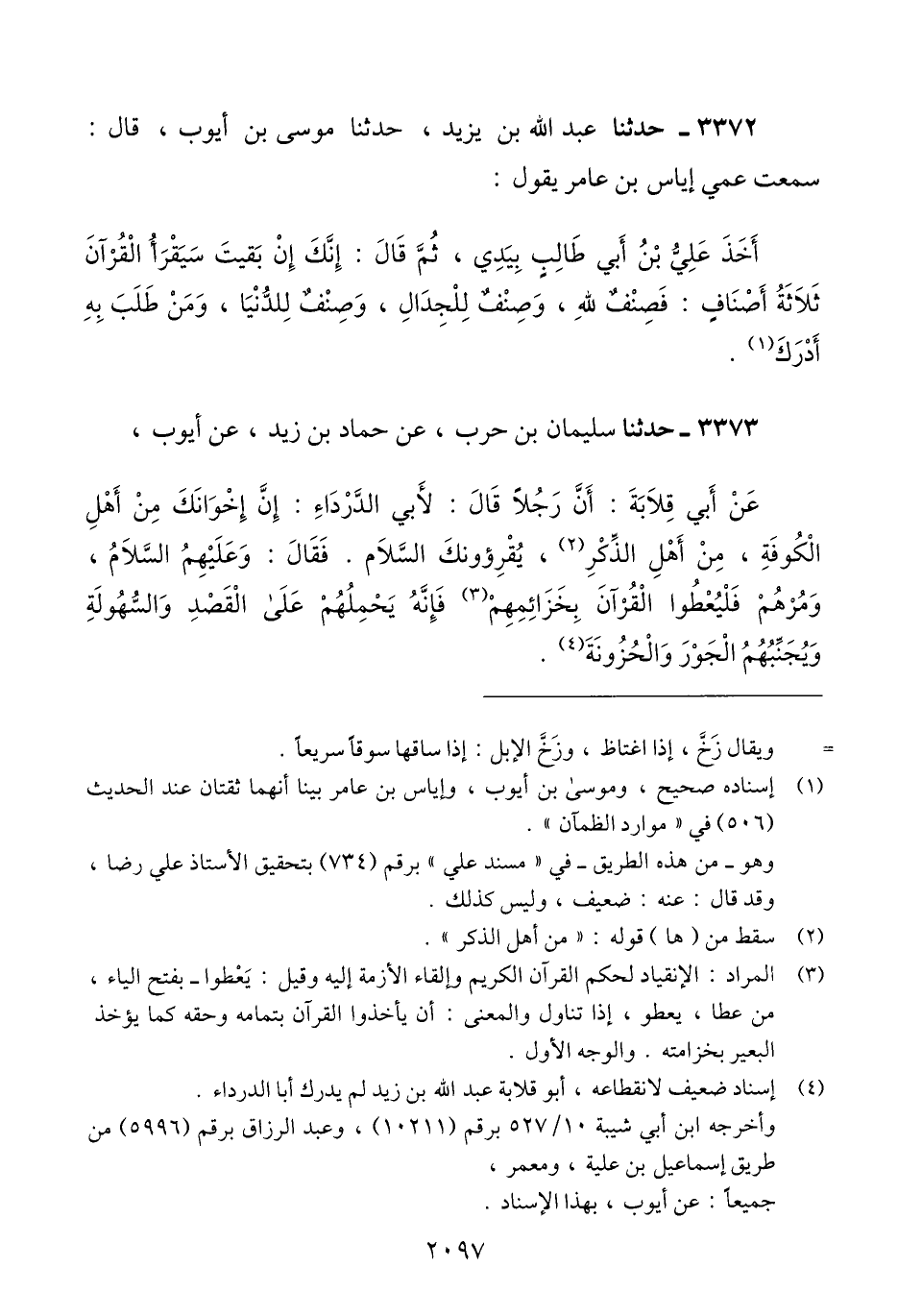 3372 - حَدَّثَنَا عَبْدُ اللَّهِ بْنُ يَزِيدَ، حَدَّثَنَا مُوسَى بْنُ أَيُّوبَ، قَالَ: سَمِعْتُ عَمِّي إِيَاسَ بْنَ عَامِرٍ، يَقُولُ: أَخَذَ عَلِيُّ بْنُ أَبِي طَالِبٍ، بِيَدِي، ثُمَّ قَالَ: " إِنَّكَ إِنْ بَقِيتَ §سَيَقْرَأُ الْقُرْآنَ ثَلَاثَةُ أَصْنَافٍ: فَصِنْفٌ لِلَّهِ، وَصِنْفٌ لِلْجِدَالِ، وَصِنْفٌ لِلدُّنْيَا، وَمَنْ طَلَبَ بِهِ أَدْرَكَ "Qإسناده صحيح