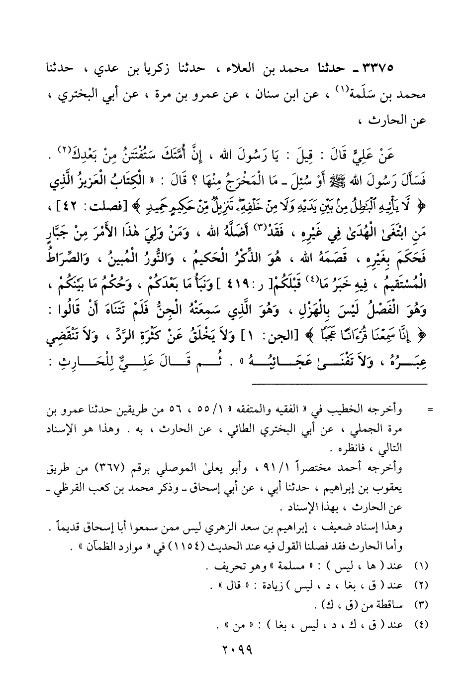 3375 - حَدَّثَنَا مُحَمَّدُ بْنُ الْعَلَاءِ، حَدَّثَنَا زَكَرِيَّا بْنُ عَدِيٍّ، حَدَّثَنَا مُحَمَّدُ بْنُ سَلَمَةَ، عَنْ أَبِي سِنَانٍ، عَنْ عَمْرِو بْنِ مُرَّةَ، عَنْ أَبِي الْبَخْتَرِيِّ، عَنْ الْحَارِثِ، عَنْ عَلِيٍّ، قَالَ: قِيلَ: يَا رَسُولَ اللَّهِ، إِنَّ أُمَّتَكَ سَتُفْتَتَنُ مِنْ بَعْدِكَ، فَسَأَلَ رَسُولَ اللَّهِ صَلَّى اللهُ عَلَيْهِ وَسَلَّمَ أَوْ سُئِلَ مَا الْمَخْرَجُ مِنْهَا؟ قَالَ: " §الْكِتَابُ الْعَزِيزُ الَّذِي {لَا يَأْتِيهِ الْبَاطِلُ مِنْ بَيْنِ يَدَيْهِ وَلَا مِنْ خَلْفِهِ تَنْزِيلٌ مِنْ حَكِيمٍ حَمِيدٍ} [فصلت: 42] مَنْ ابْتَغَى الْهُدَى فِي غَيْرِهِ، فقد أَضَلَّهُ اللَّهُ، وَمَنْ وَلِيَ هَذَا الْأَمْرَ مِنْ جَبَّارٍ فَحَكَمَ بِغَيْرِهِ، قَصَمَهُ اللَّهُ، هُوَ الذِّكْرُ الْحَكِيمُ، وَالنُّورُ الْمُبِينُ، وَالصِّرَاطُ الْمُسْتَقِيمُ، فِيهِ خَبَرُ مَا قَبْلَكُمْ، وَنَبَأُ مَا بَعْدَكُمْ، وَحُكْمُ مَا بَيْنَكُمْ، وَهُوَ الْفَصْلُ لَيْسَ بِالْهَزْلِ، وَهُوَ الَّذِي سَمِعَتْهُ الْجِنُّ فَلَمْ تَتَنَاهَ أَنْ قَالُوا: {إِنَّا سَمِعْنَا قُرْآنًا عَجَبًا يَهْدِي إِلَى الرُّشْدِ} [الجن: 2] وَلَا يَخْلَقُ عَنْ كَثْرَةِ الرَّدِّ، وَلَا تَنْقَضِي عِبَرُهُ، وَلَا تَفْنَى عَجَائِبُهُ ". ثُمَّ قَالَ عَلِيٌّ لِلْحَارِثِ: -[2100]- خُذْهَا إِلَيْكَ يَا أَعْوَرُQإسناده حسن