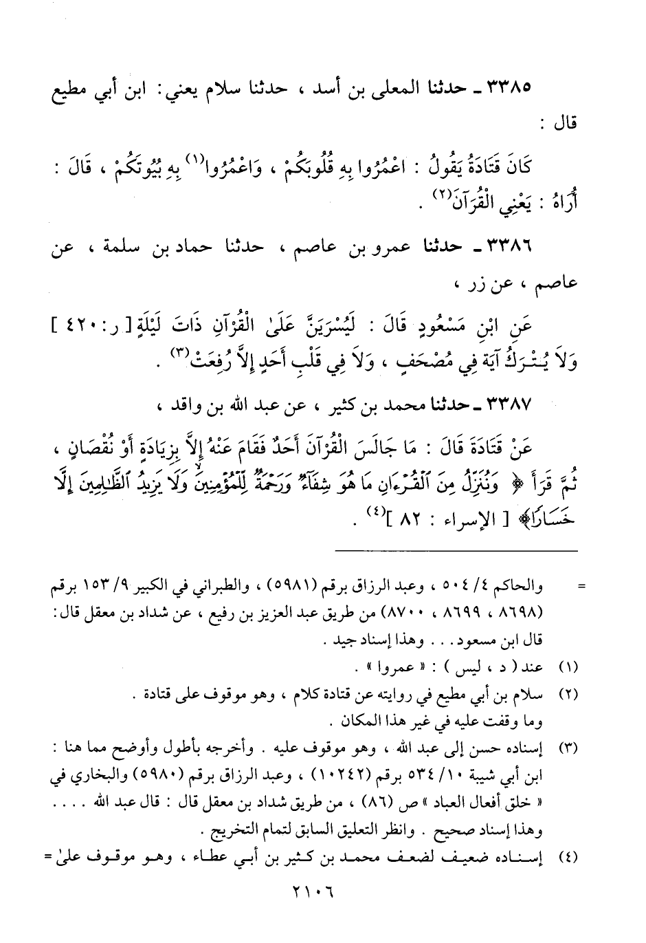 3385 - حَدَّثَنَا الْمُعَلَّى بْنُ أَسَدٍ، حَدَّثَنَا سَلَّامٌ يَعْنِي ابْنَ أَبِي مُطِيعٍ، قَالَ: كَانَ قَتَادَةُ، يَقُولُ: «§اعْمُرُوا بِهِ قُلُوبَكُمْ، وَاعْمُرُوا بِهِ بُيُوتَكُمْ»، قَالَ: أُرَاهُ: يَعْنِي الْقُرْآنَQسلام بن أبي مطيع في روايته عن قتادة كلام وهو موقوف على قتادة. وما وقفت عليه في غير هذا المكان