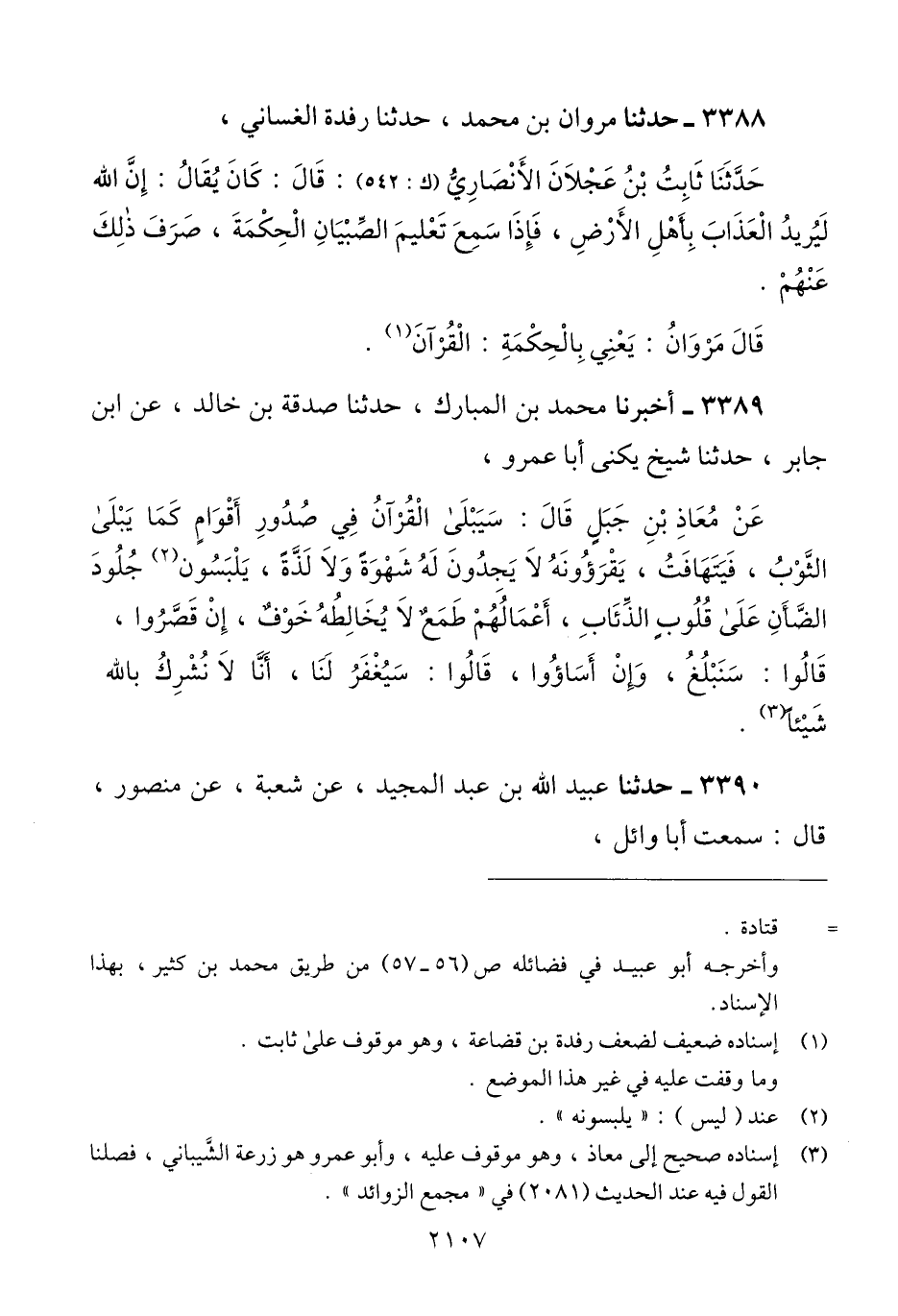 3389 - أَخْبَرَنَا مُحَمَّدُ بْنُ الْمُبَارَكِ، حَدَّثَنَا صَدَقَةُ بْنُ خَالِدٍ، عَنْ ابْنِ جَابِرٍ، حَدَّثَنَا شَيْخٌ يُكَنَّى أَبَا عُمَرَ، عَنْ مُعَاذِ بْنِ جَبَلٍ، قَالَ: " §سَيَبْلَى الْقُرْآنُ فِي صُدُورِ أَقْوَامٍ كَمَا يَبْلَى الثَّوْبُ، فَيَتَهَافَتُ، يَقْرَءُونَهُ لَا يَجِدُونَ لَهُ شَهْوَةً وَلَا لَذَّةً، يَلْبَسُونَ جُلُودَ الضَّأْنِ عَلَى قُلُوبِ الذِّئَابِ، أَعْمَالُهُمْ طَمَعٌ لَا يُخَالِطُهُ خَوْفٌ، إِنْ قَصَّرُوا، قَالُوا: سَنَبْلُغُ، وَإِنْ أَسَاءُوا، قَالُوا: سَيُغْفَرُ لَنَا، إِنَّا لَا نُشْرِكُ بِاللَّهِ شَيْئًا "Qإسناده صحيح إلى معاذ وهو موقوف عليه
