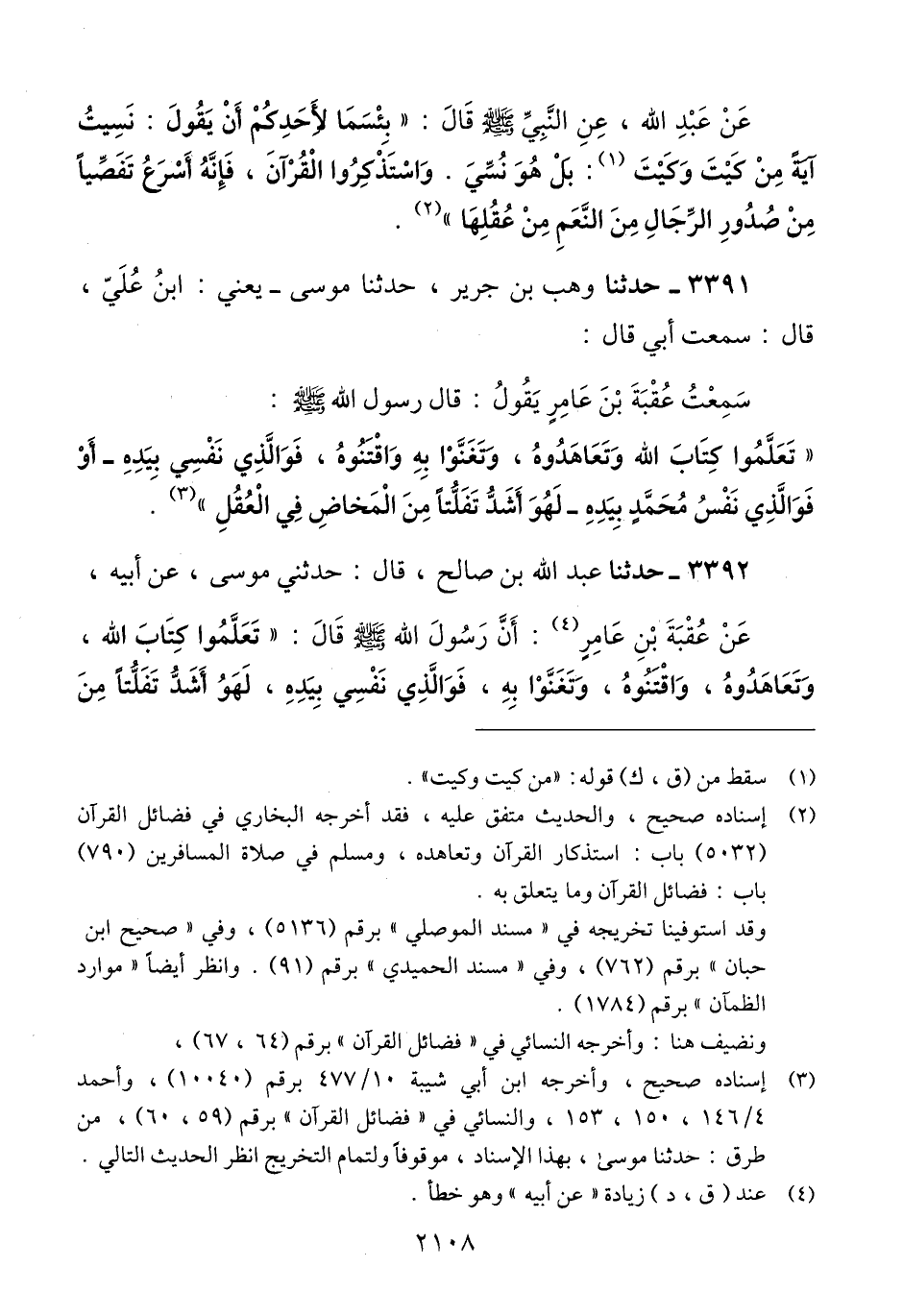 3392 - حَدَّثَنَا عَبْدُ اللَّهِ بْنُ صَالِحٍ، قَالَ: حَدَّثَنِي مُوسَى، عَنْ أَبِيهِ، عَنْ عُقْبَةَ بْنِ عَامِرٍ، أَنَّ رَسُولَ اللَّهِ صَلَّى اللهُ عَلَيْهِ وَسَلَّمَ قَالَ: «§تَعَلَّمُوا كِتَابَ اللَّهِ وَتَعَاهَدُوهُ، وَاقْتَنُوهُ، وَتَغَنَّوْا بِهِ، فَوَالَّذِي نَفْسِي بِيَدِهِ، لَهُوَ أَشَدُّ تَفَلُّتًا مِنَ -[2109]- الْمَخَاضِ فِي الْعُقُلِ» Qإسناده ضعيف لضعف عبد الله بن صالح